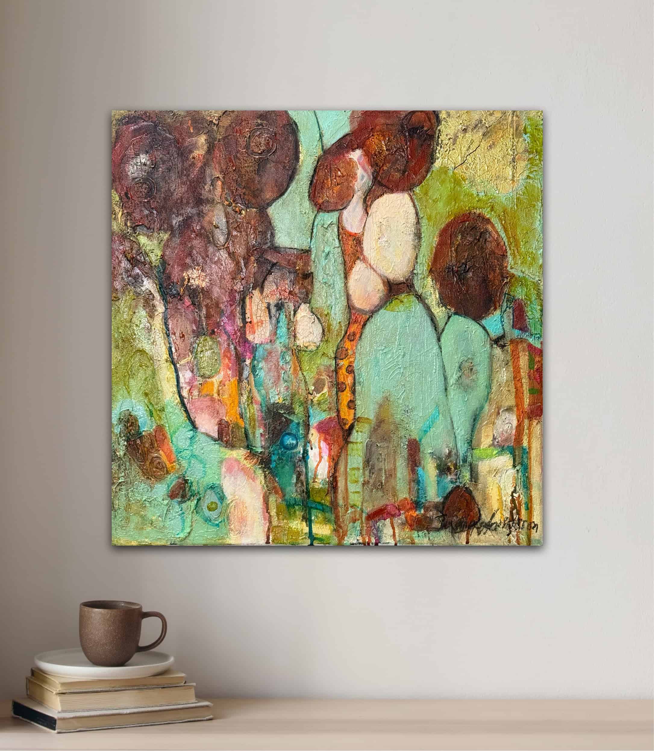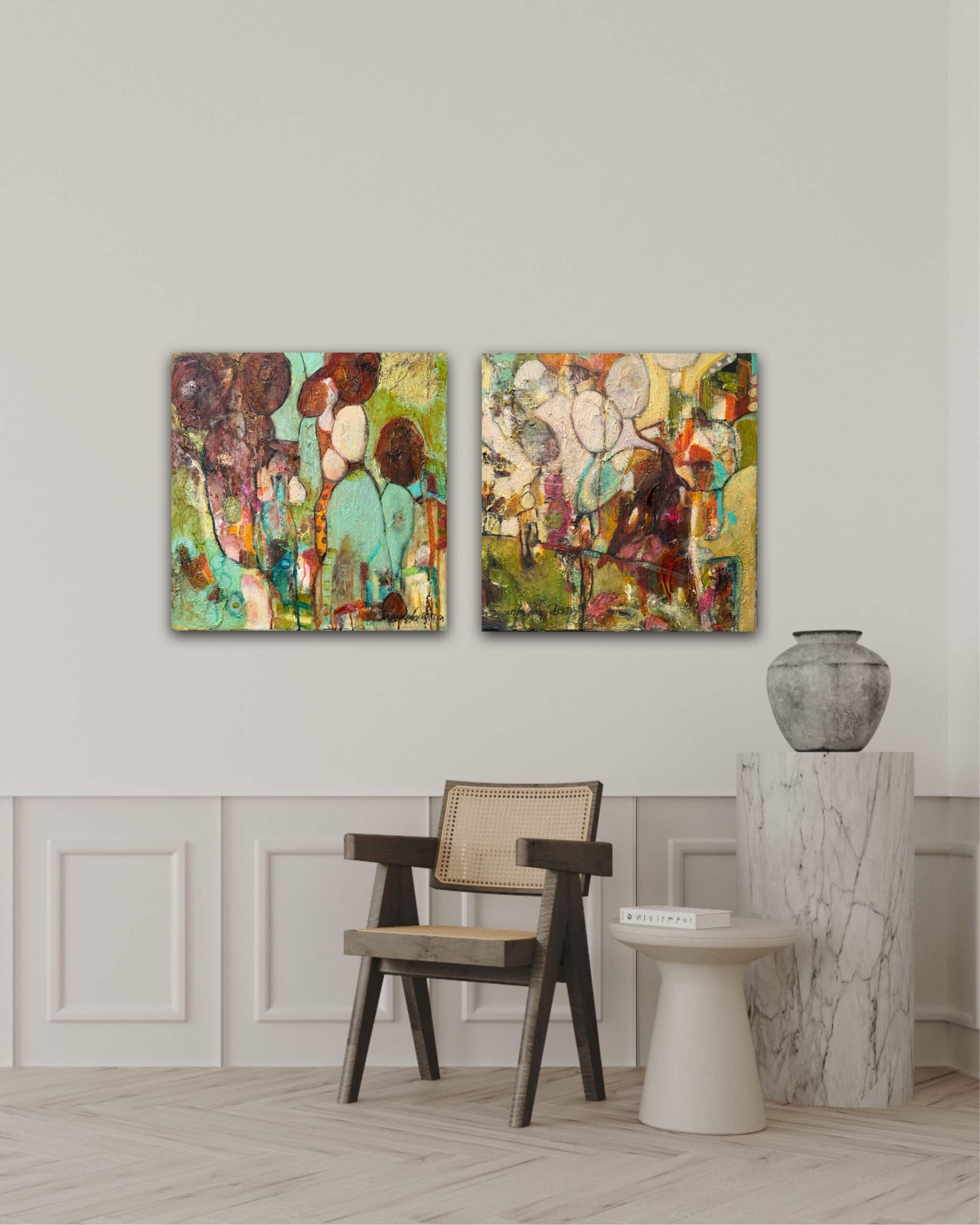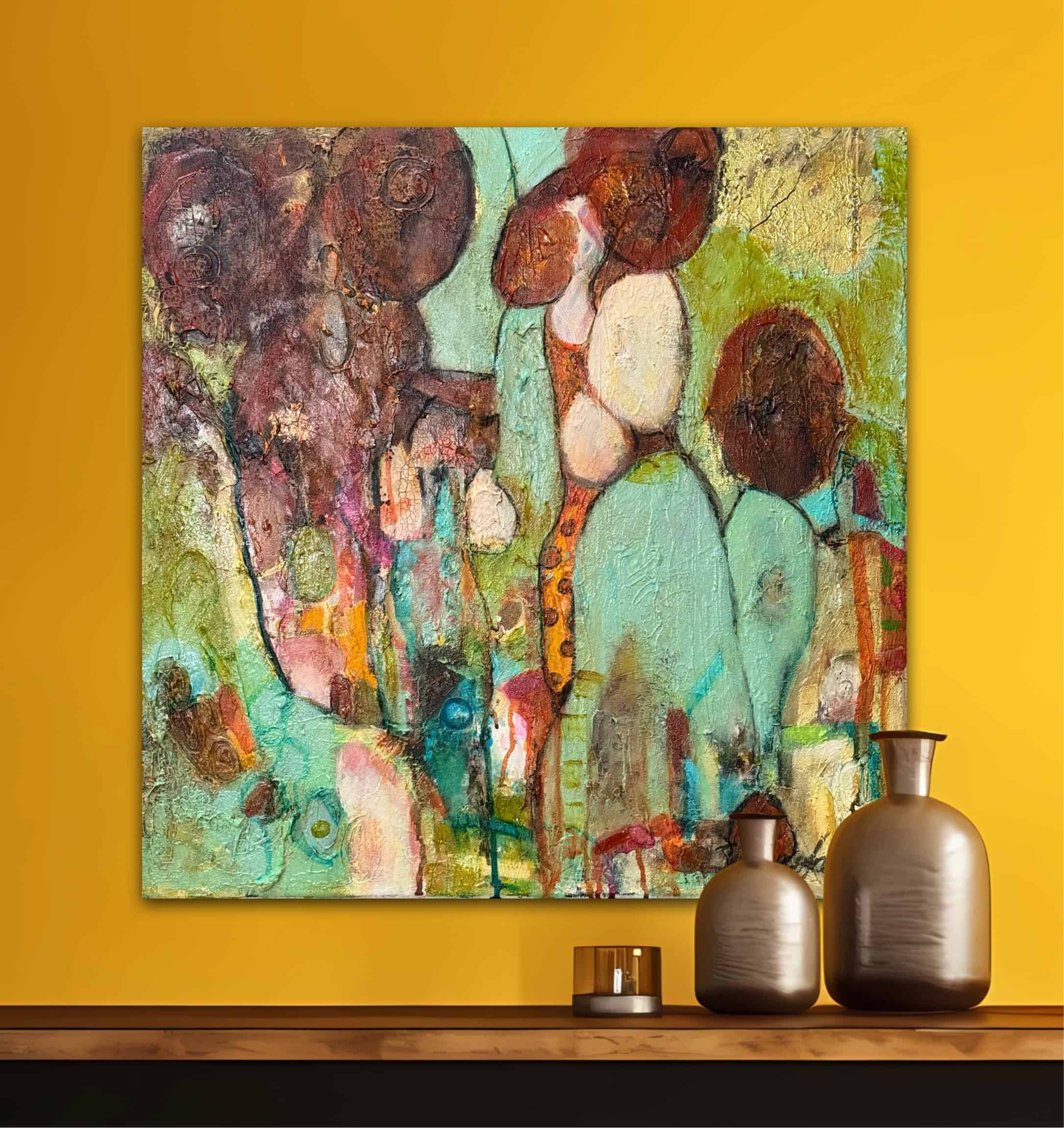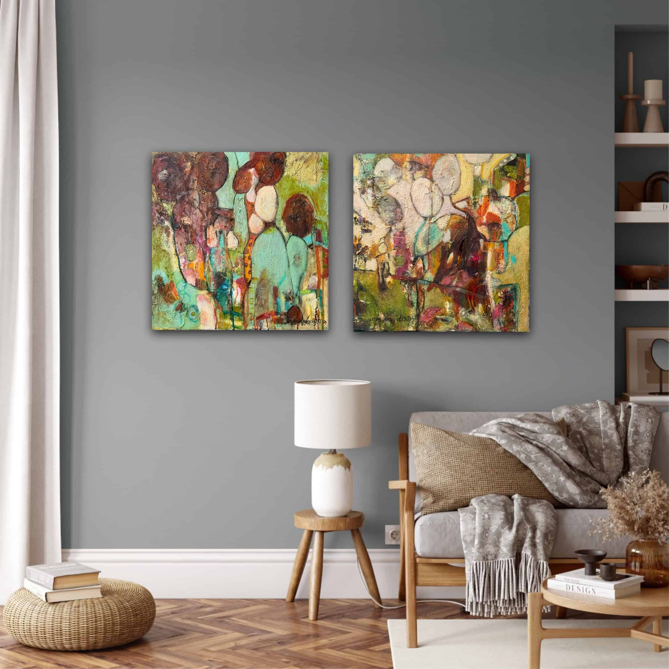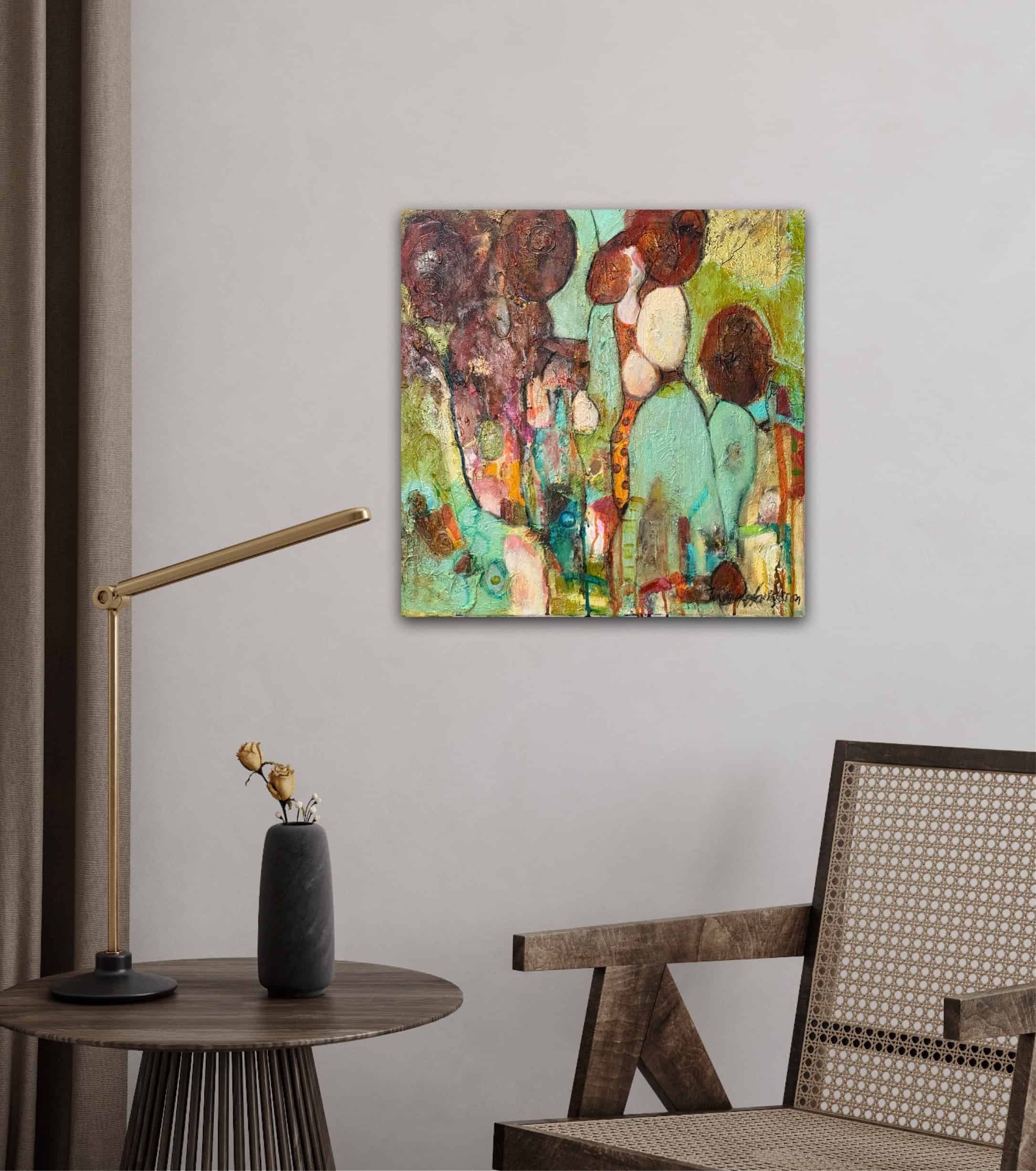 Denna tavla passar särskilt bra tillsammans med min andra abstrakta målning i liknande retrostil. Tillsammans kan de skapa en sammanhängande och stilfull helhet på väggen, oavsett om ditt hem har teakmöbler, vintageinredning eller en mer minimalistisk stil där tavlorna kan bli en djärv färgaccent.
