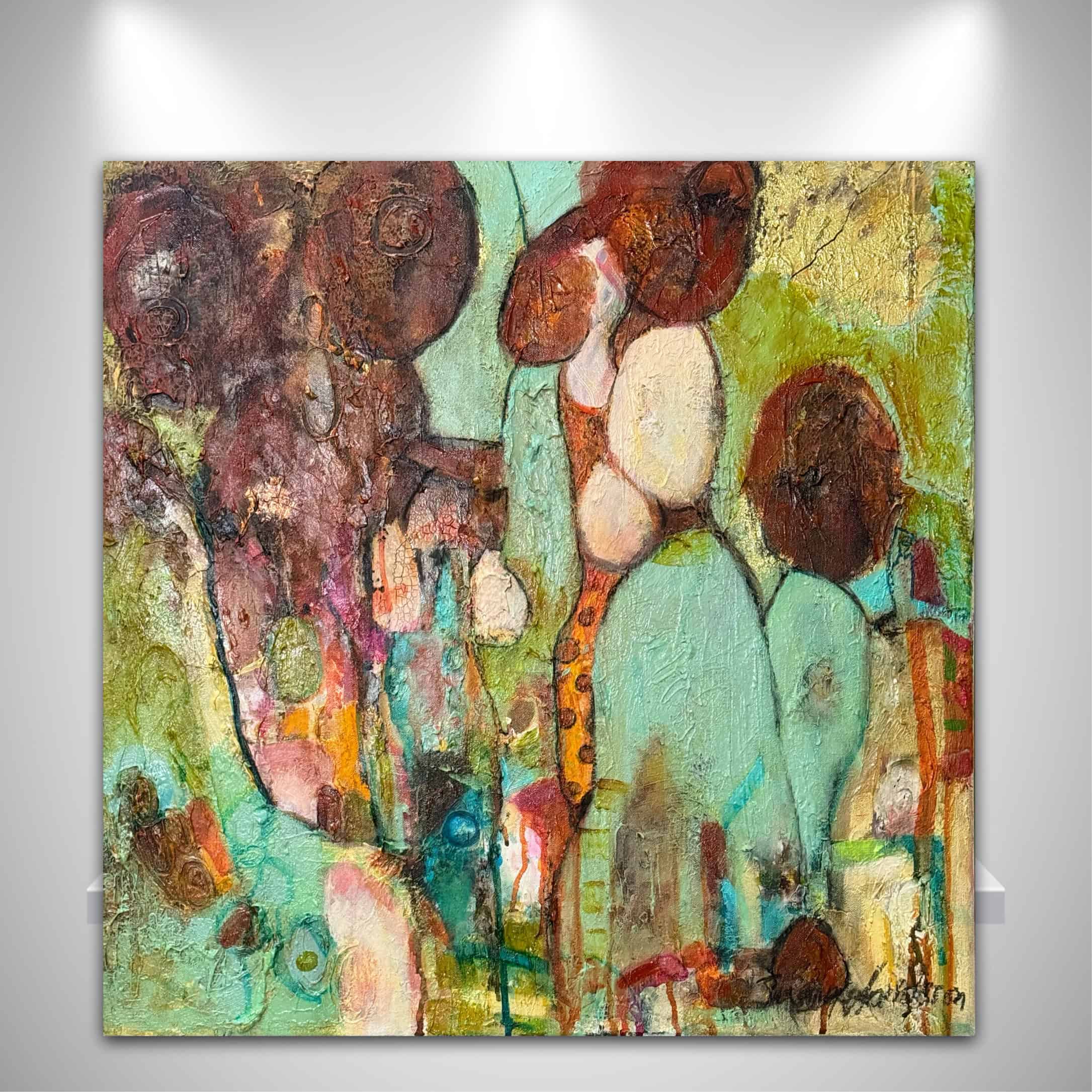 Abstrakt retroinspirerad tavla – Titel – Skiftningar i Tidlöshet. Letar du efter en tavla som ger ditt hem en modern men samtidigt tidlös känsla? Denna abstrakta målning i retrostil, handmålad på canvasduk av hög kvalitet och i storleken 60 x 60 cm, är skapad med en harmonisk färgpalett av senapsgult, bränt orange, jordnära toner och petrolblå nyanser. Färgvalen och formspråket hämtar inspiration från retrostilens eleganta design, vilket gör tavlan perfekt för både moderna och mer klassiska hem.