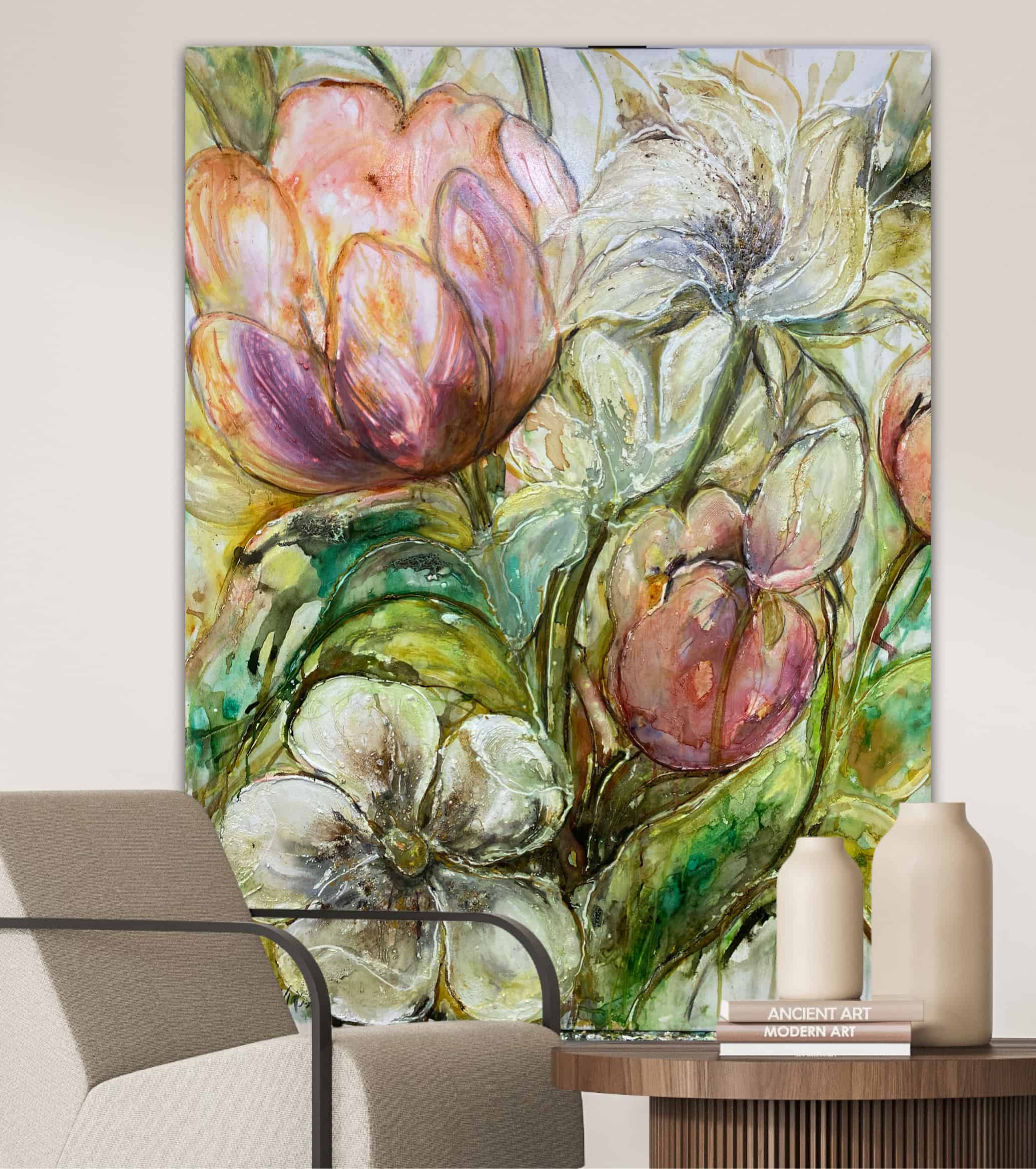 Konst till salu- Amaryllis är en målning med blommor i milda färger och där vita Amaryllis blandas med skira tulpaner.