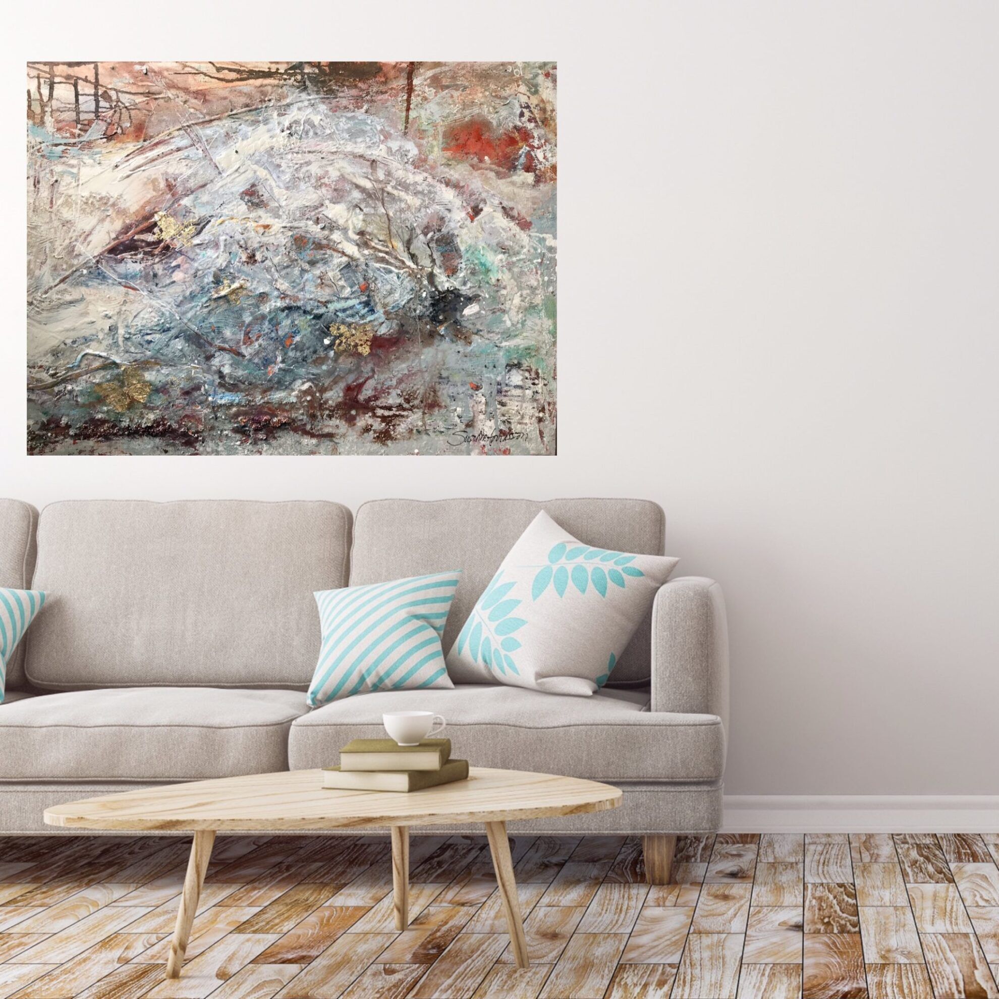 Inred med kuddar och konstverk