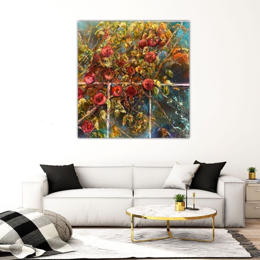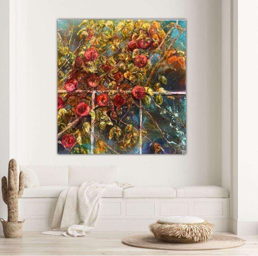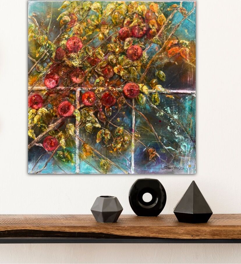 Det är struktur i tavlan Konst till salu – Innan frosten, jag har byggt upp bladen och äpplena i många tunna lager med färger för att skapa ett djup i lövverket.