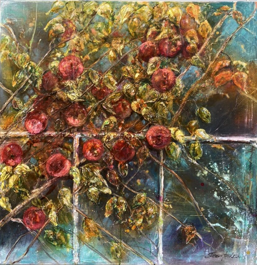 I denna målning har jag velat skapa senhöstens sista solstrålar i de köldbitna äpplena.