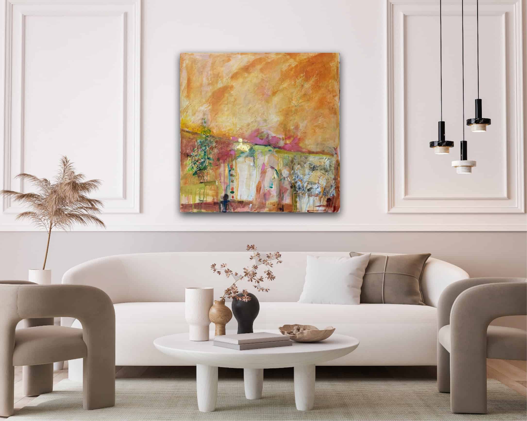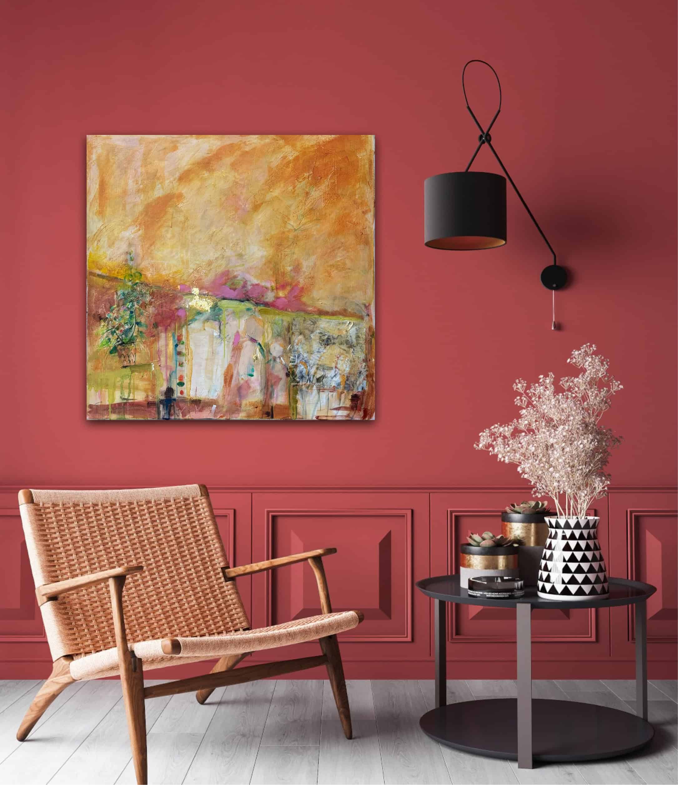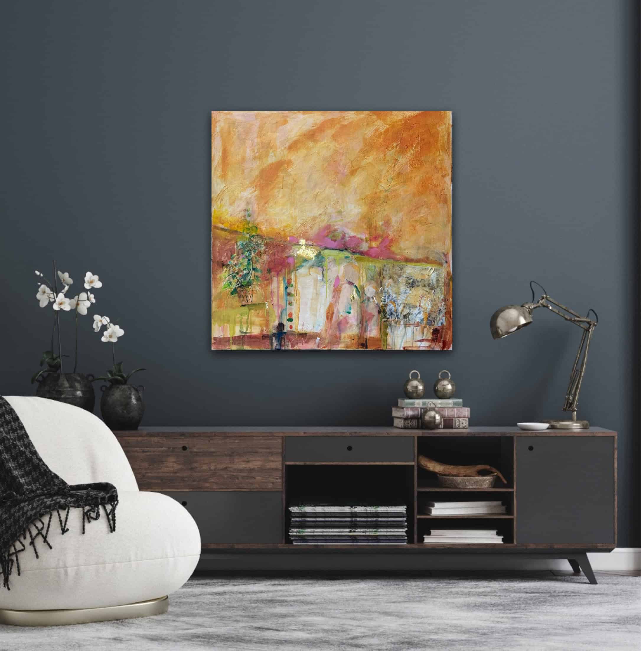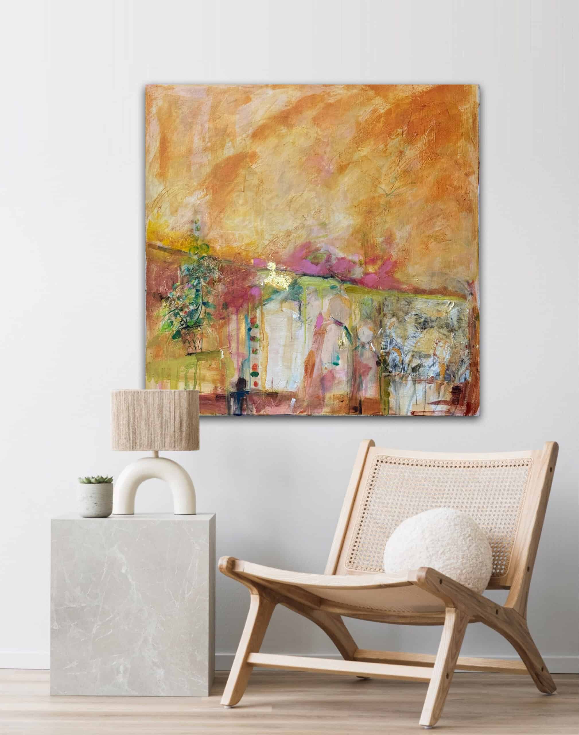 Köp dina tavlor online – Abstrakt konst i glada, varma kulörer med bladguld