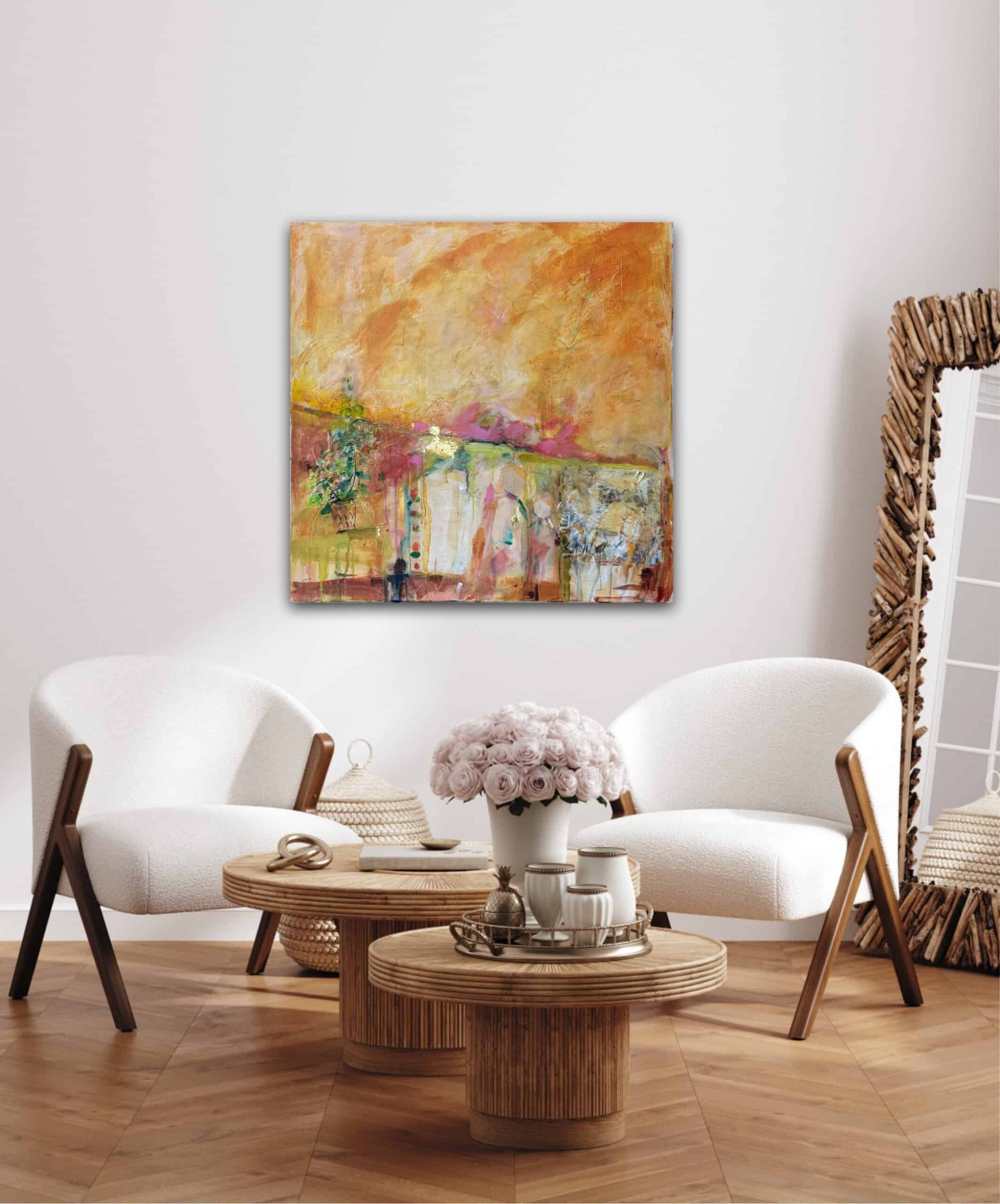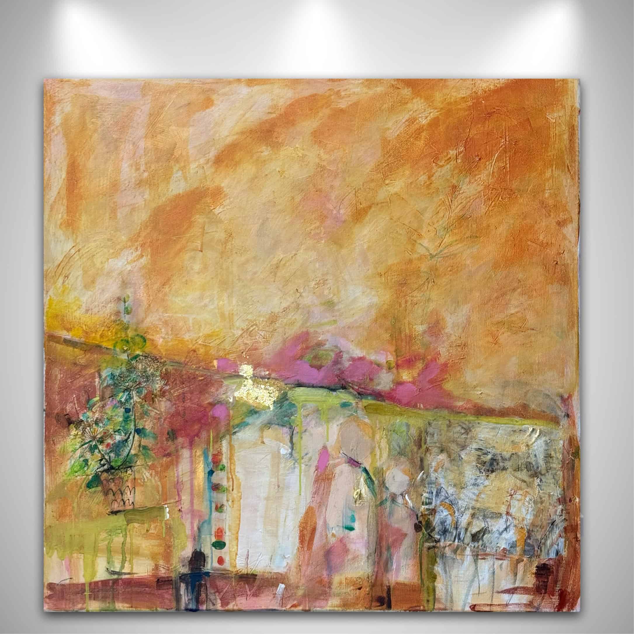 Köp dina tavlor online och låt ditt hem lysa upp med denna unika abstrakta målning i glada, varma kulörer. Tavlan mäter 80 x 80 cm och är målad med akrylfärg på duk i en livfull konststil där färgerna harmonierar för att skapa energi och känsla. Som extra finess har bladguld adderats för att ge målningen ett elegant skimmer och ett lyxigt uttryck.
