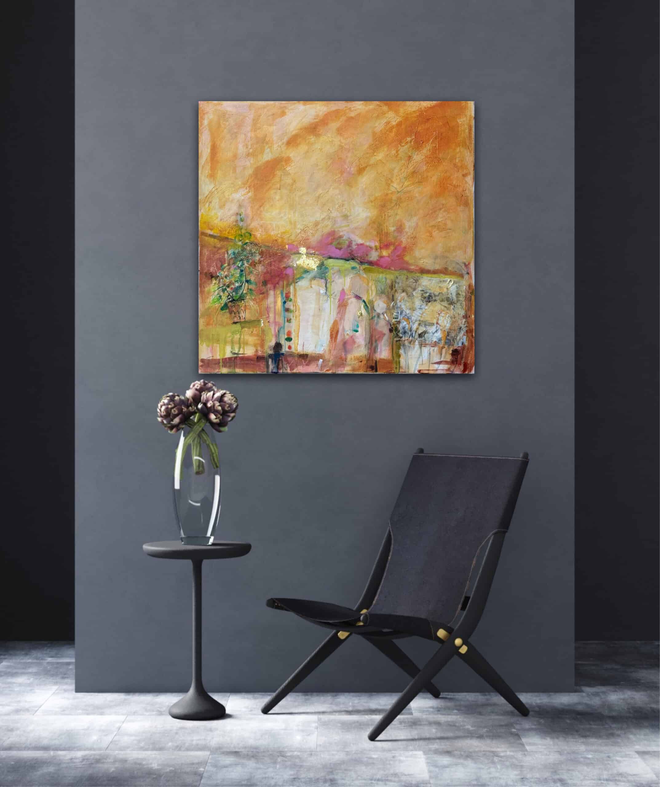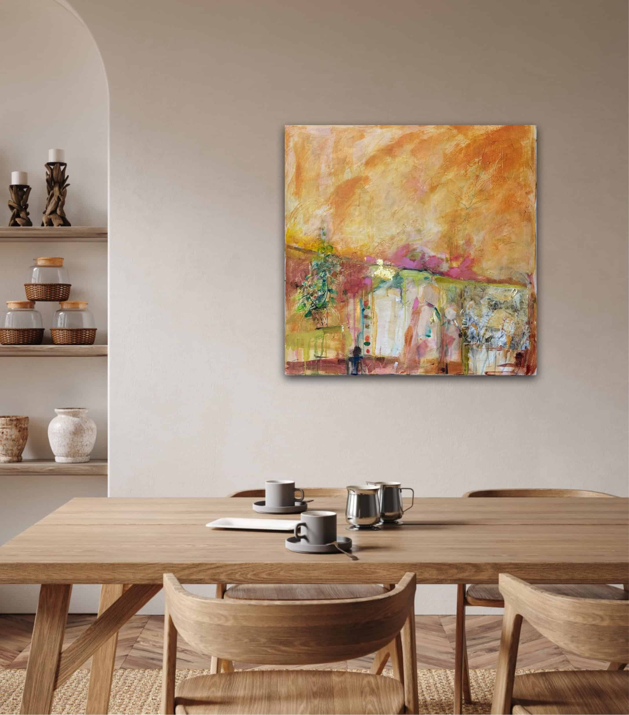 Detta originalverk är handmålat och finns endast i ett exemplar, vilket gör det till en exklusiv inredningsdetalj för dig som söker unika konstverk online. De varma tonerna tillsammans med det glimmande bladguldet ger tavlan en iögonfallande effekt och skapar en konstupplevelse som väcker både glädje och inspiration.