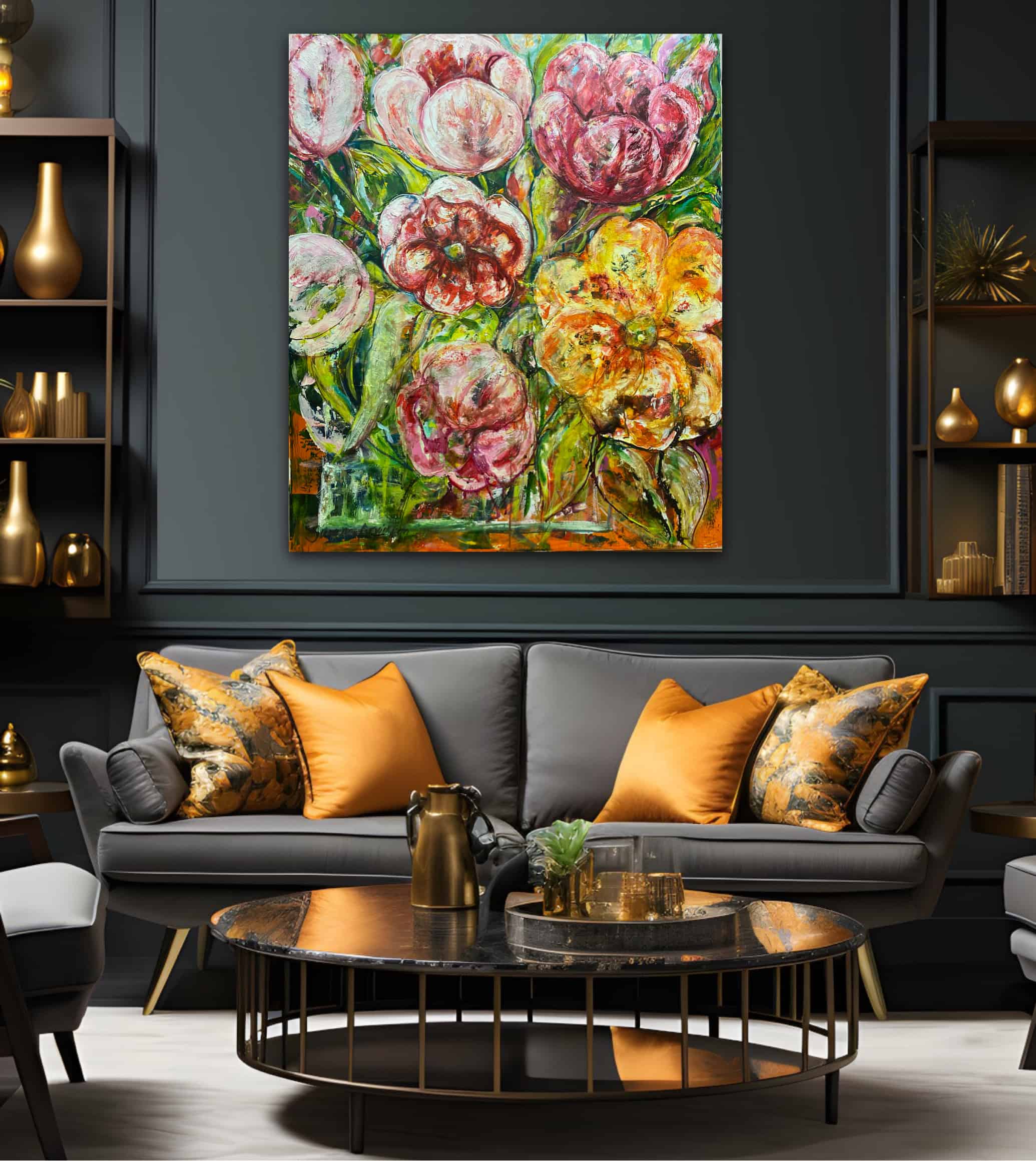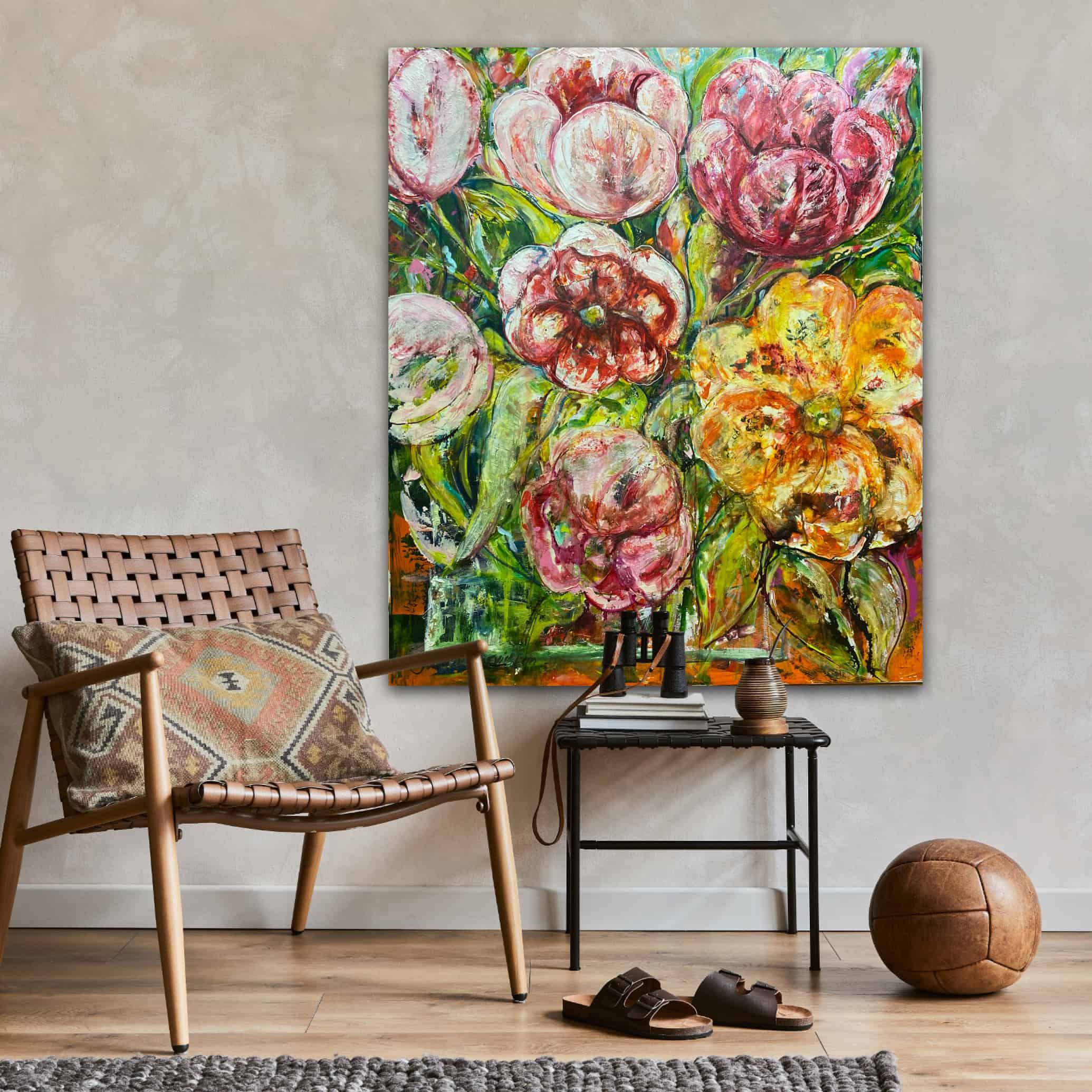 I min senaste skapelse, ”Tulpankonst: Vårens Andetag”, har jag fångat vårens essens och förvandlat den till en explosion av färger på linneduk. Denna färgsprakande tavla, är en hyllning till naturens återuppvaknande, inramad och uppspänd på en stadig kilram för att garantera dess tidlösa skönhet.