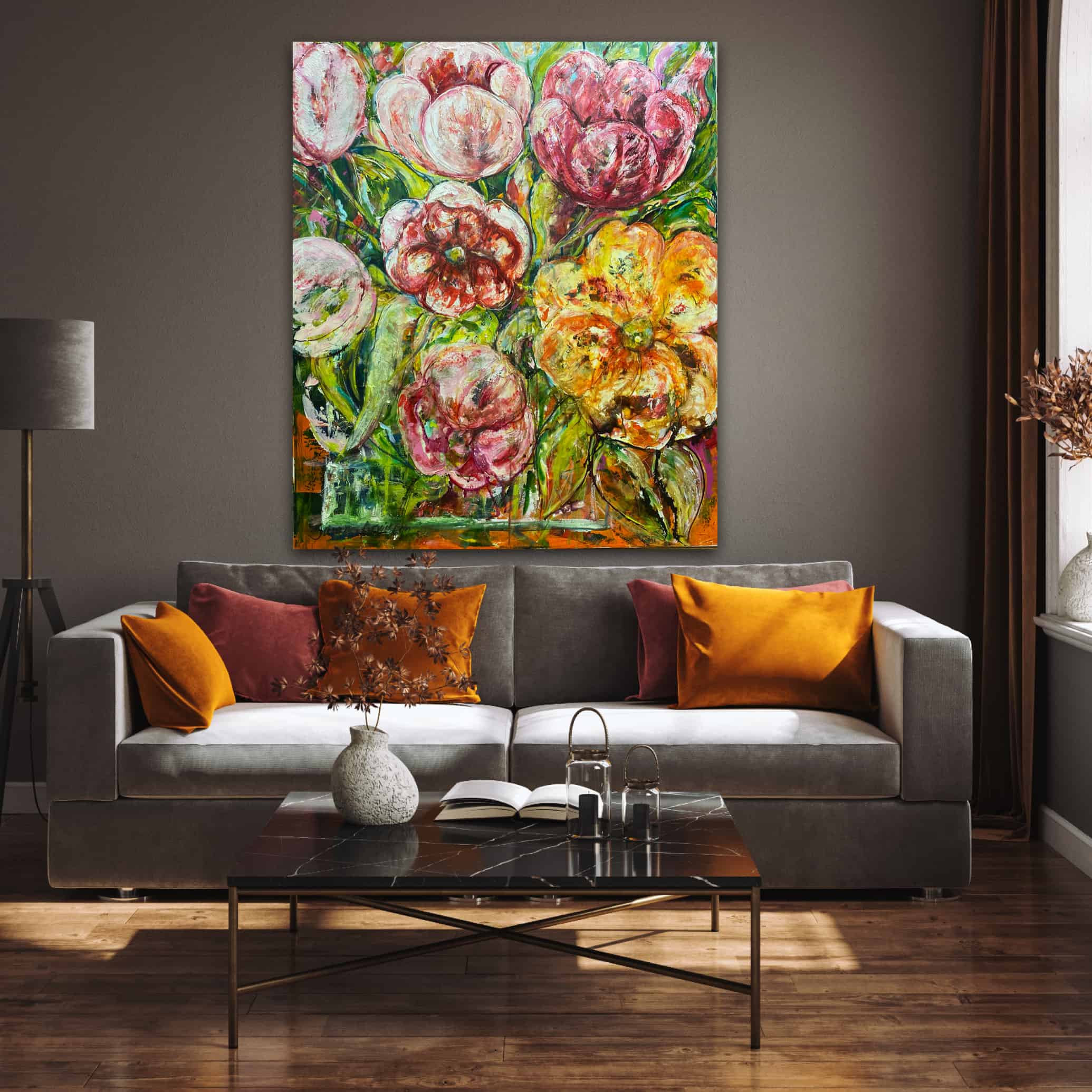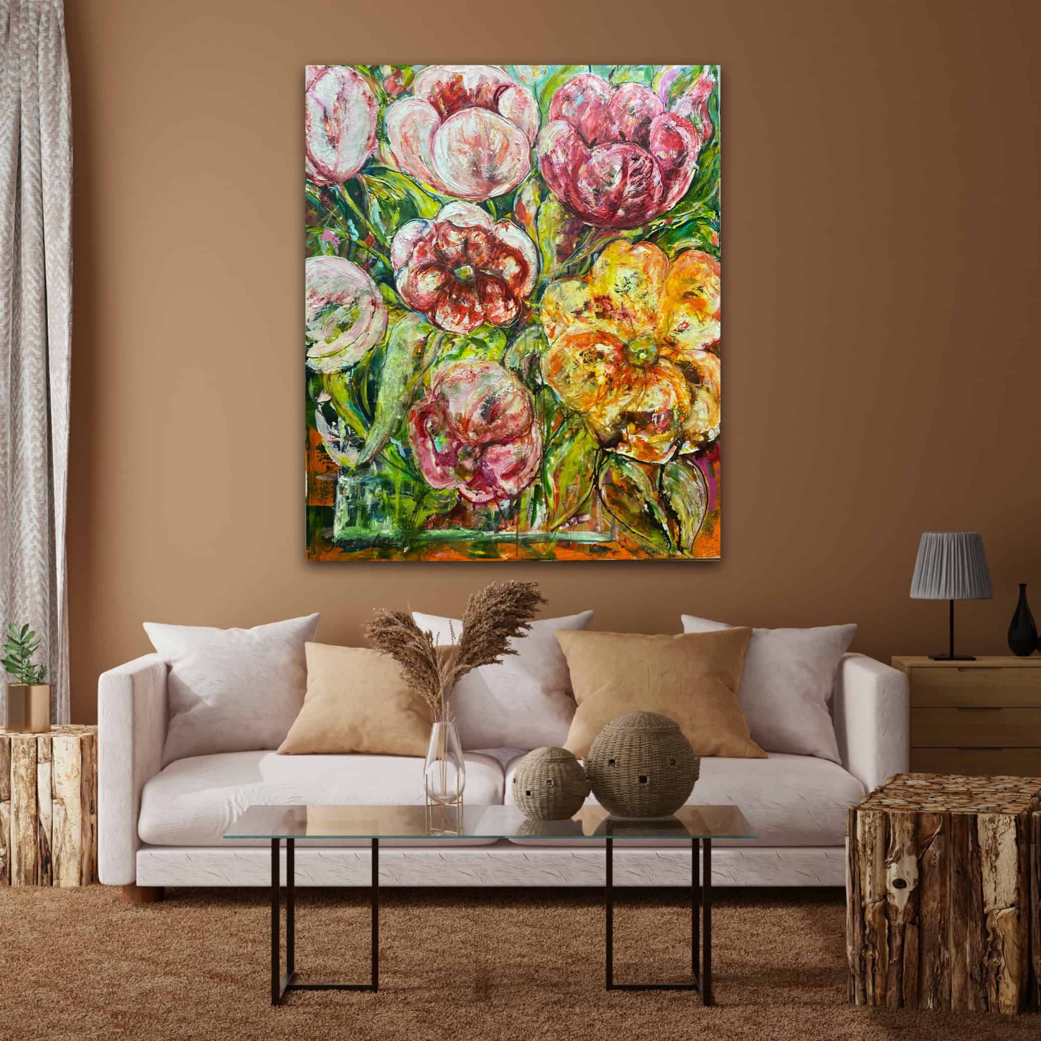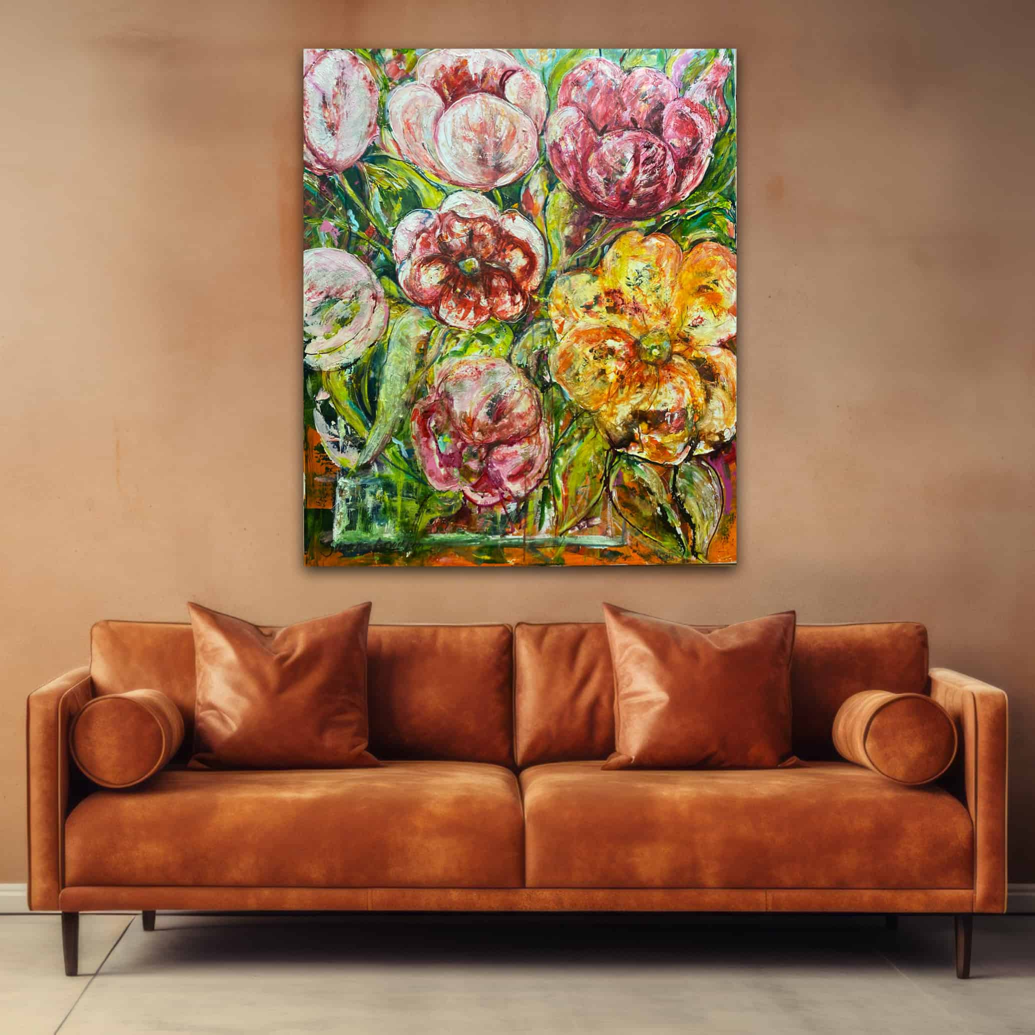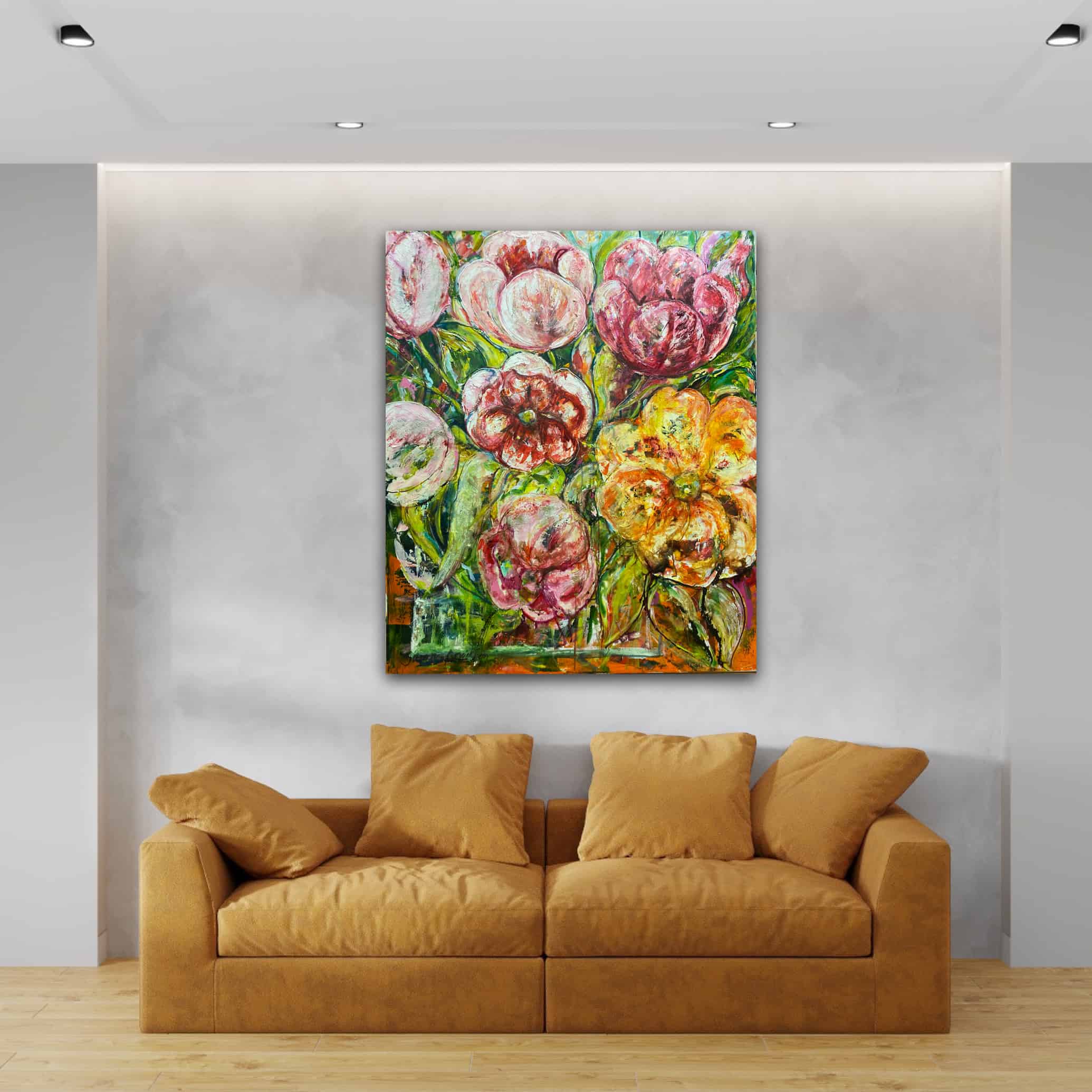 Köp färgsprakande Tulpankonst:”Vårens Andetag” är en tavla vars dimensioner är 100 x 120 cm.