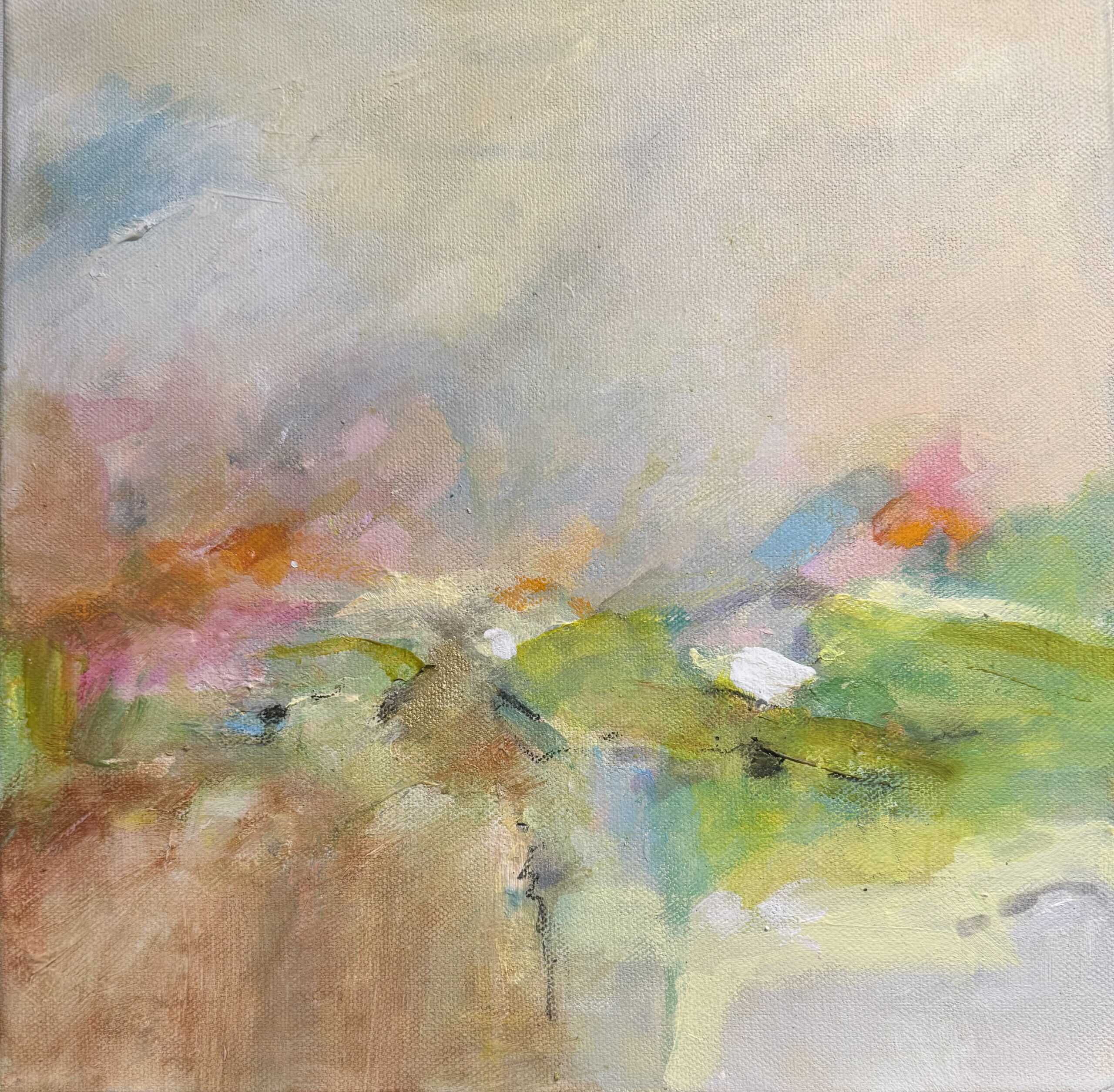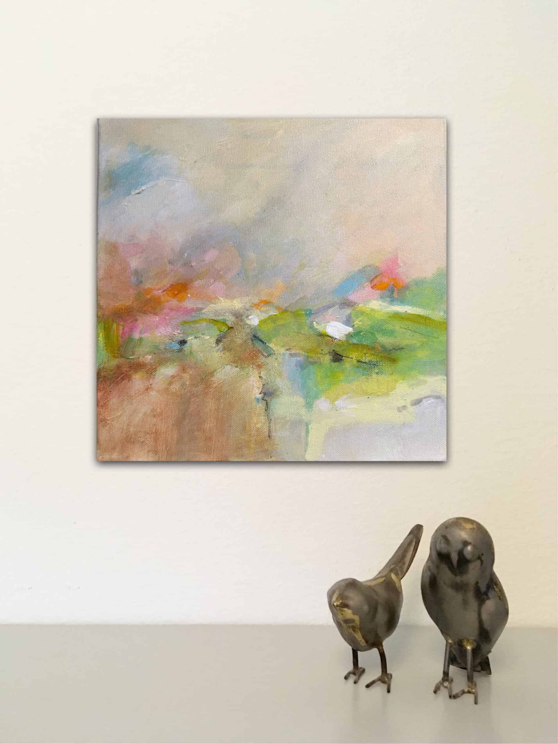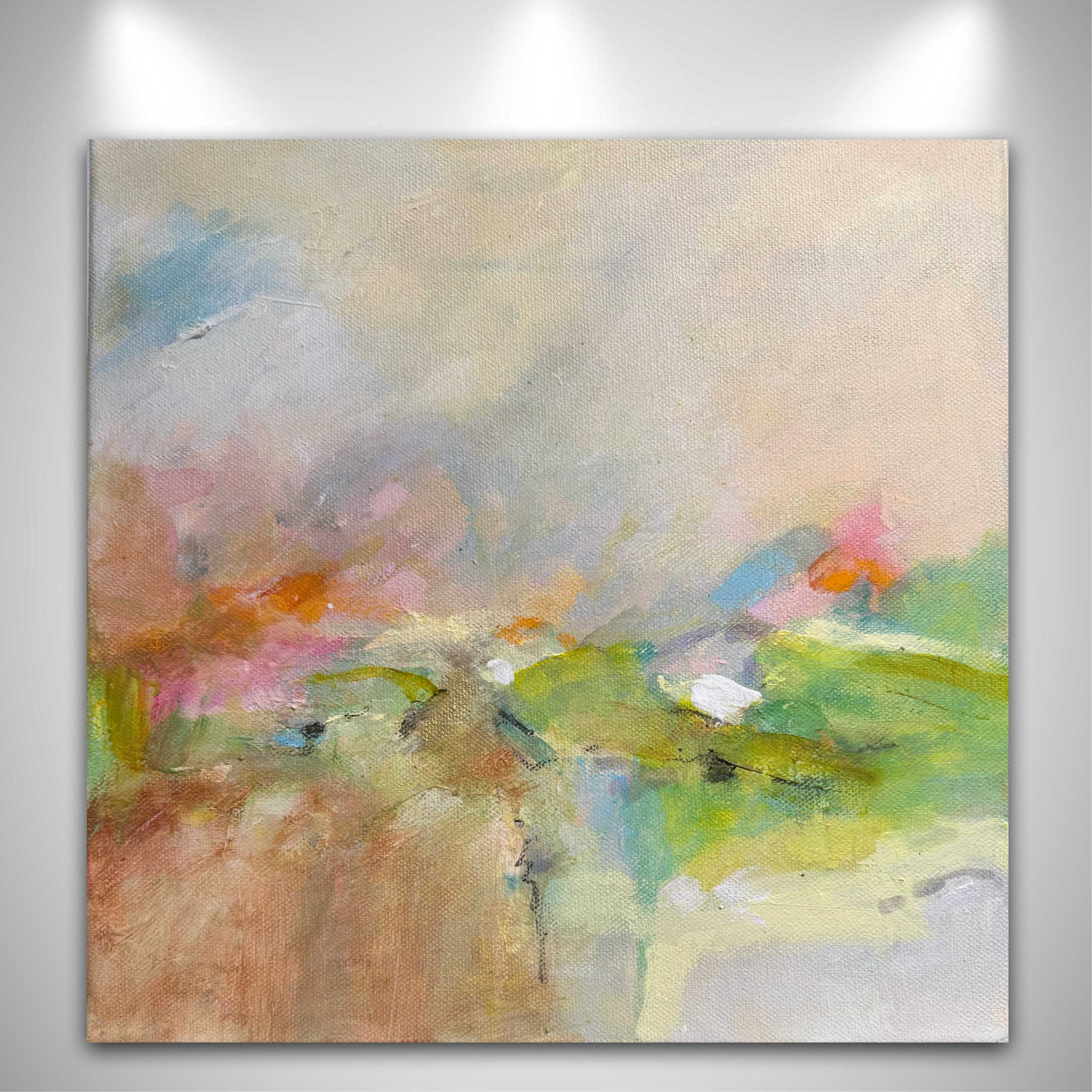 Låt blicken vandra genom detta abstrakta landskap, där färger och former smälter samman i en harmonisk och drömsk komposition. Mjuka övergångar och subtila kontraster skapar en känsla av djup, som om landskapet sträcker sig bortom horisonten. Varje penseldrag bär på en rörelse, en berättelse utan ord, där betraktaren själv får fylla i detaljerna.