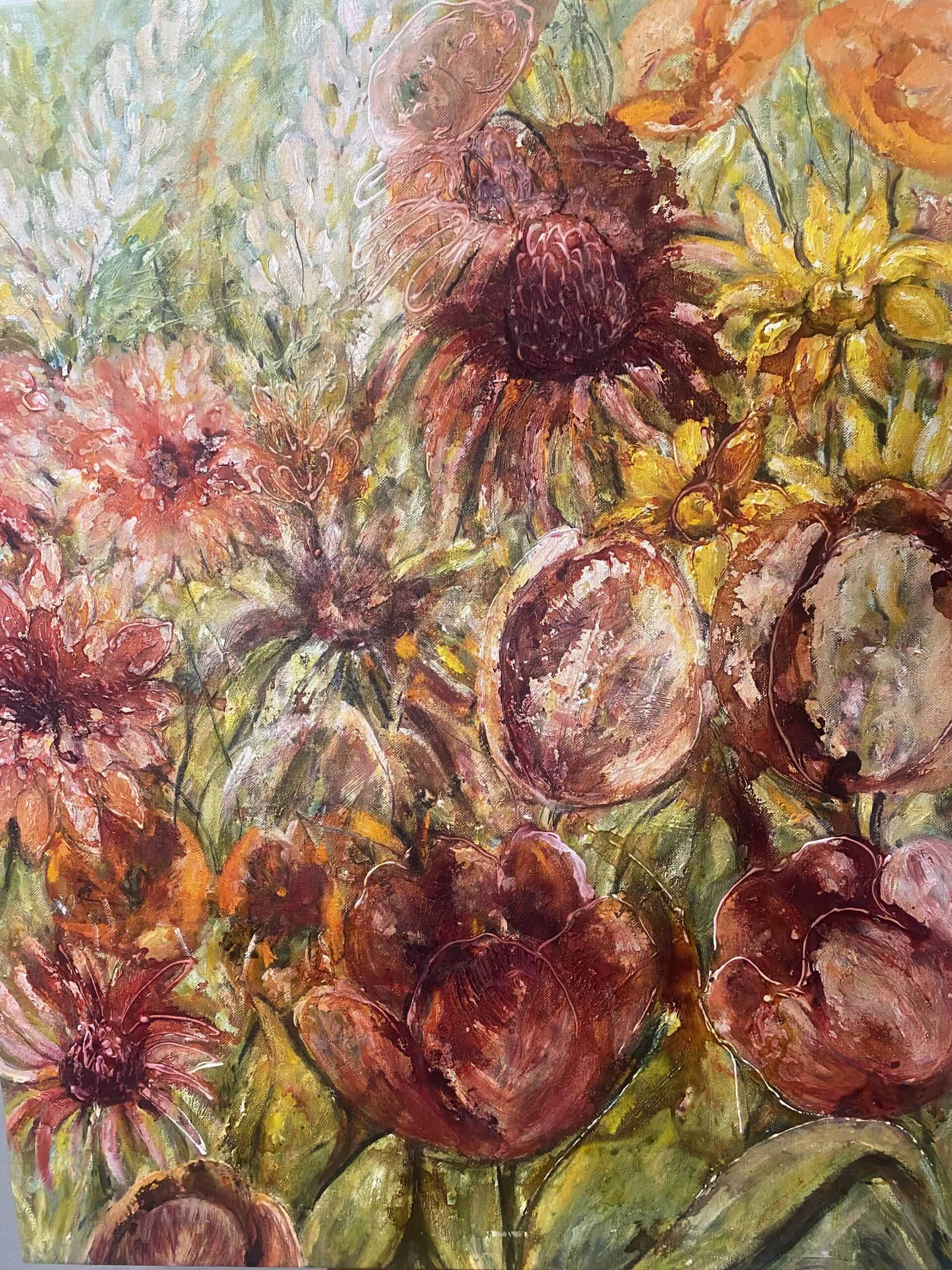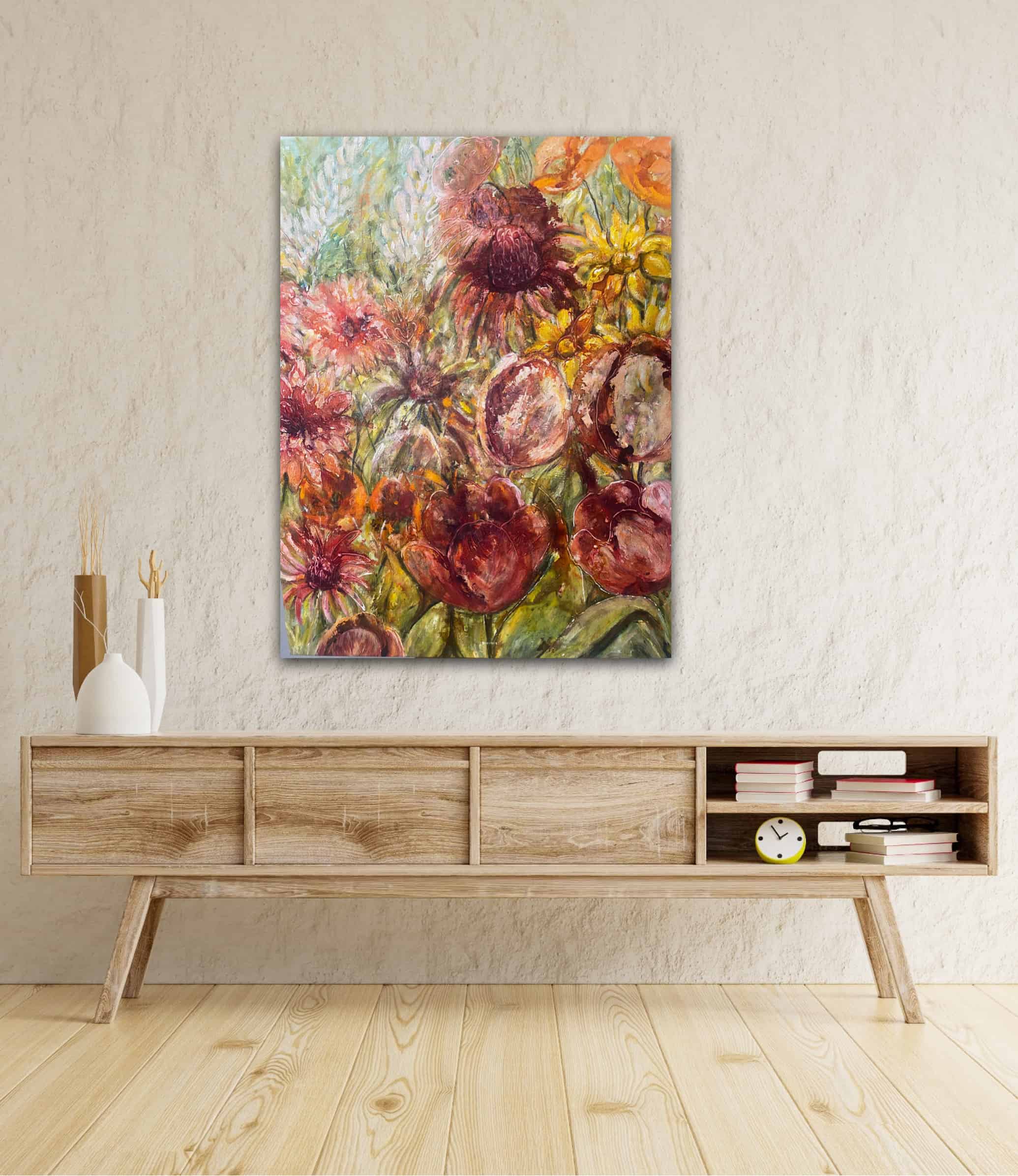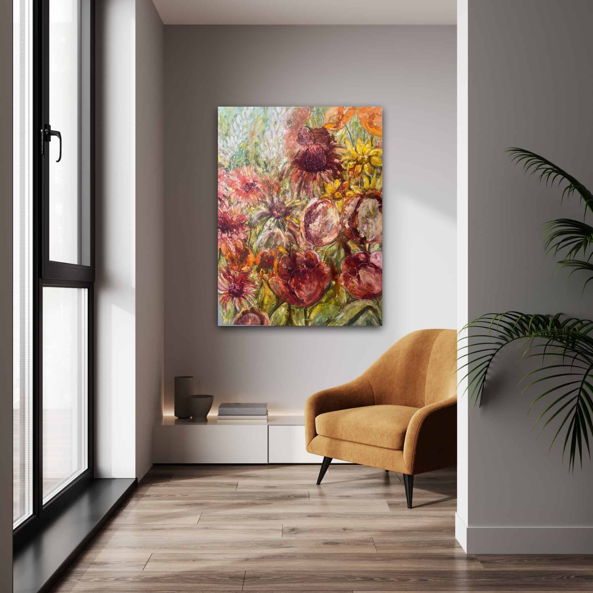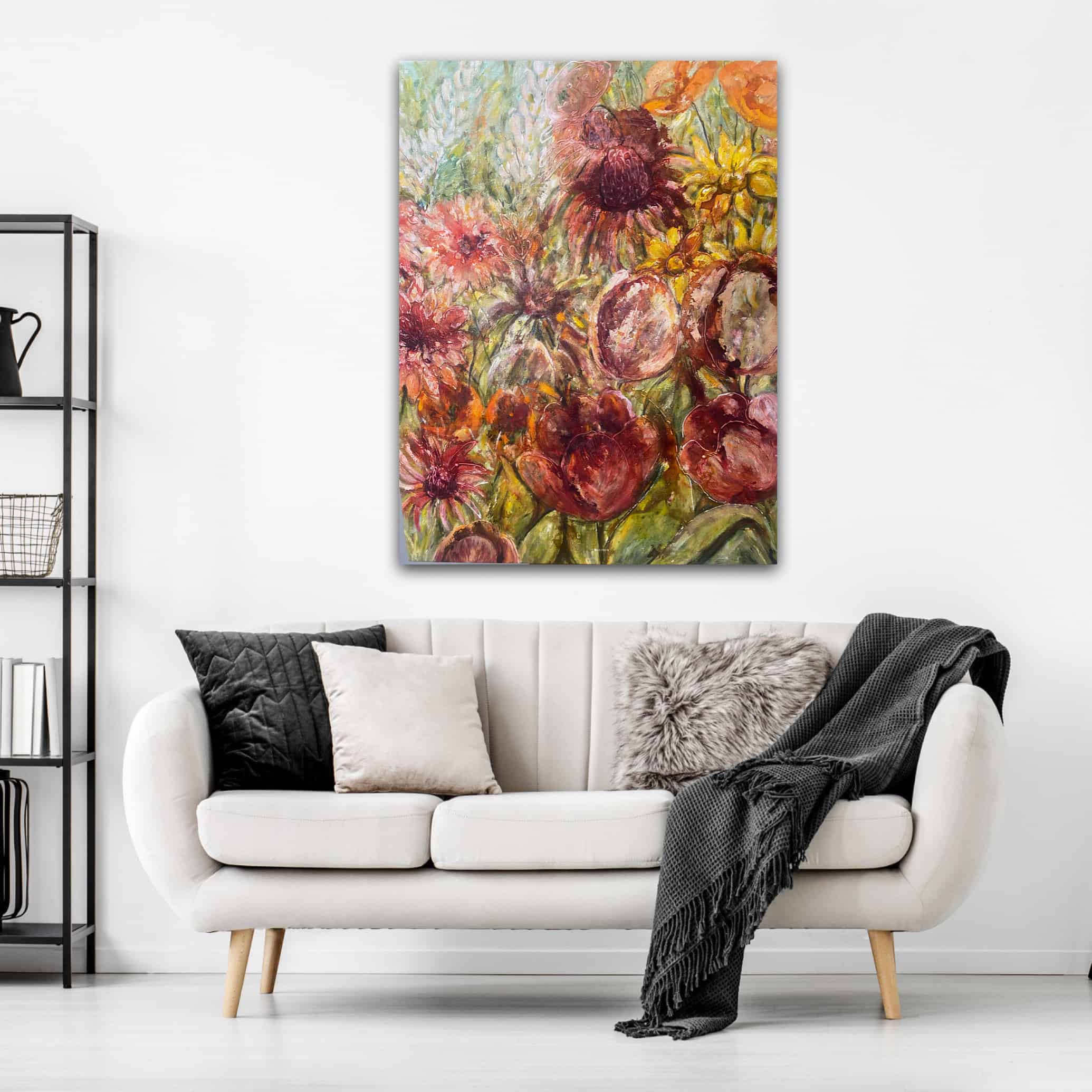 Denna målning är en skapelse som fångar höstens magi i all dess prakt. Med djupa nyanser av vinrött, varmrosa, och fängslande oranger och gula toner, blir tavlan en hyllning till den gyllene säsongen. Genom penseldragen där jag inte eftersträvar blommornas exakthet väver jag in naturens övergång från sensommaren till hösten på ett sätt som tar betraktaren med på en visuell resa.