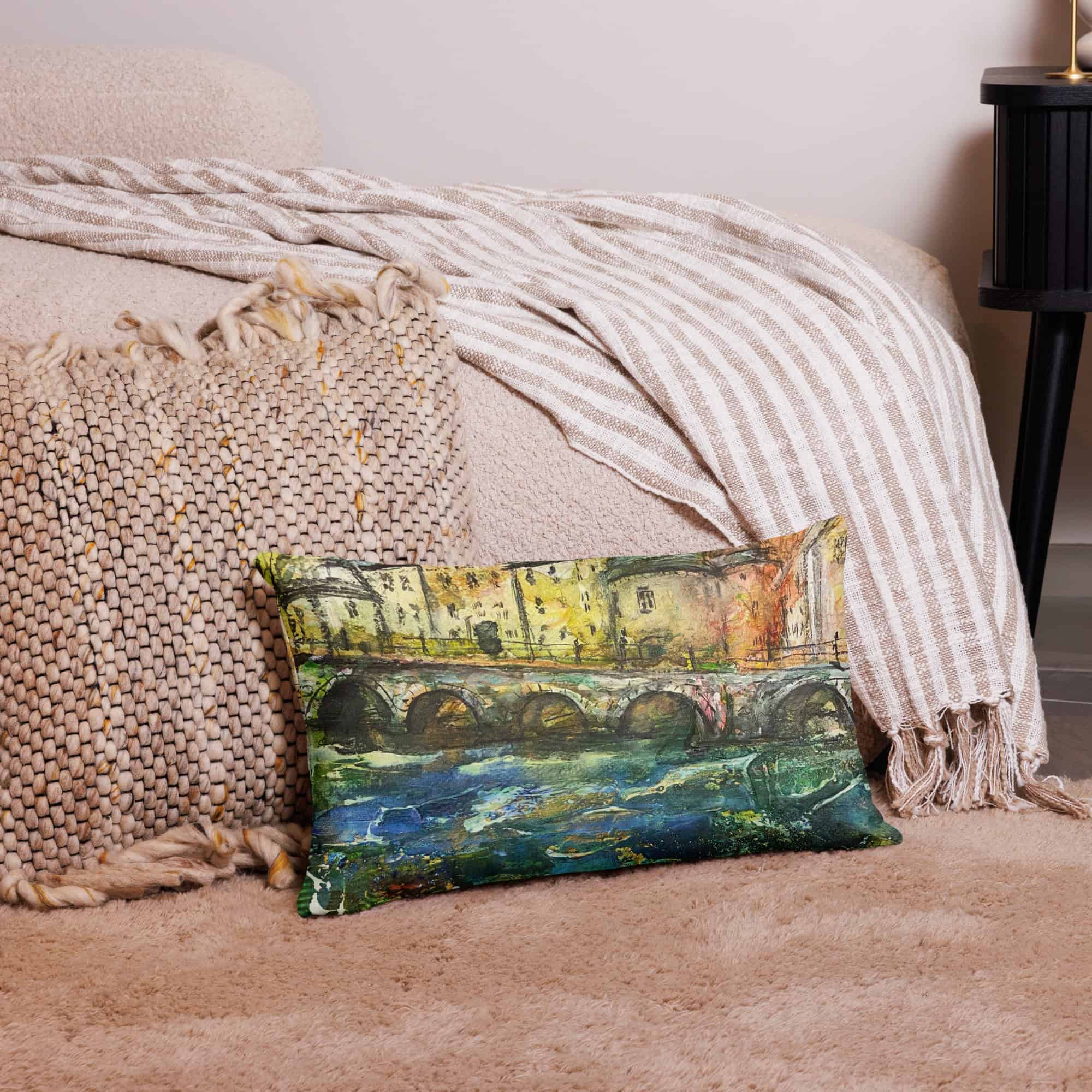 Kuddfodral med Örebro-motiv – Kanslibron och Slottet är ett unikt och elegant tillskott till ditt hem. En innerkudde som mäter 50 x 30 cm skulle passa bra till ett kuddfodral i storleken 20 x 12 tum (cirka 50,8 x 30,5 cm).Detta kuddfodral fångar den historiska Kanslibron, en vacker stenbro som stolt sträcker sig över Svartån och leder fram till Örebro Slott i bakgrunden. Kanslibron har i århundraden varit en viktig passage och är idag en älskad symbol för Örebros arkitektoniska och kulturella arv.