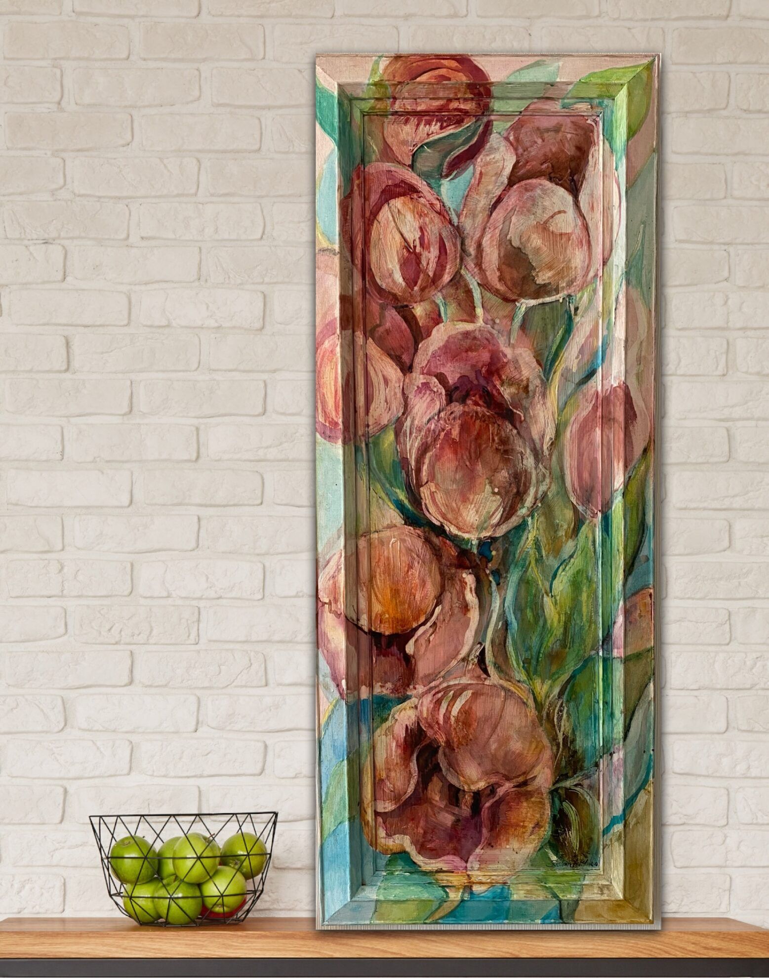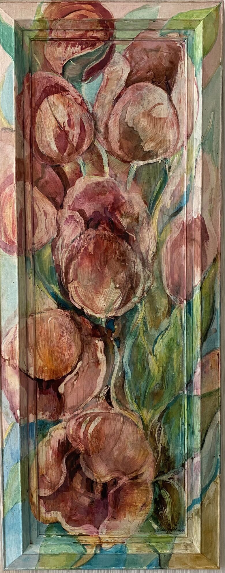 Långsmal tavla i mjuka färger med titeln Tulpanens Dag.