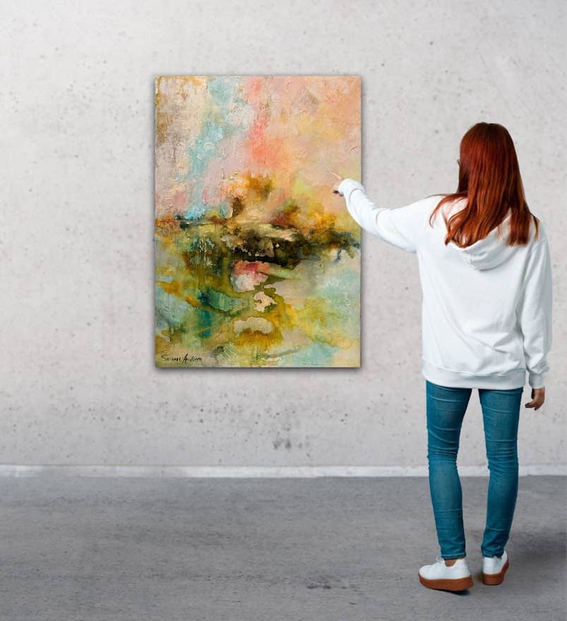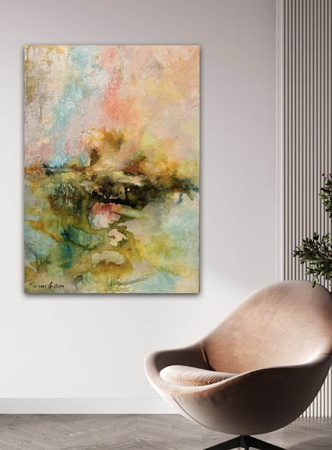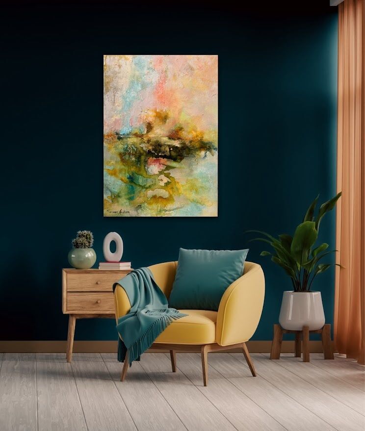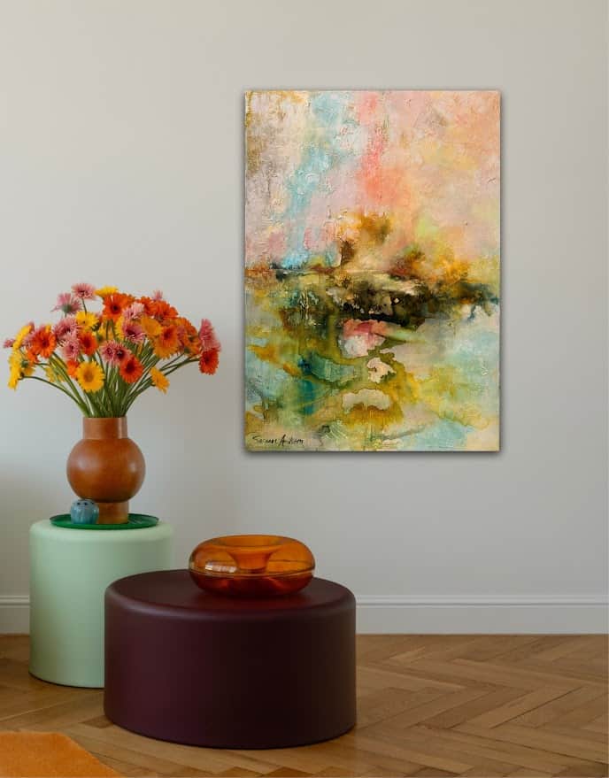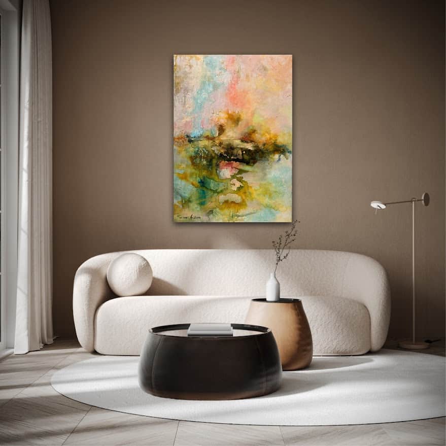 De mjuka, varma färgtonerna för tankarna till jord och natur, och de abstrakta formerna låter landskap anas – kanske avlägsna kullar eller horisonter i dis. Målningen fångar den sköra balansen mellan rörelse och stillhet, och rymmer en slags tyst närvaro som nästan går att ta på.