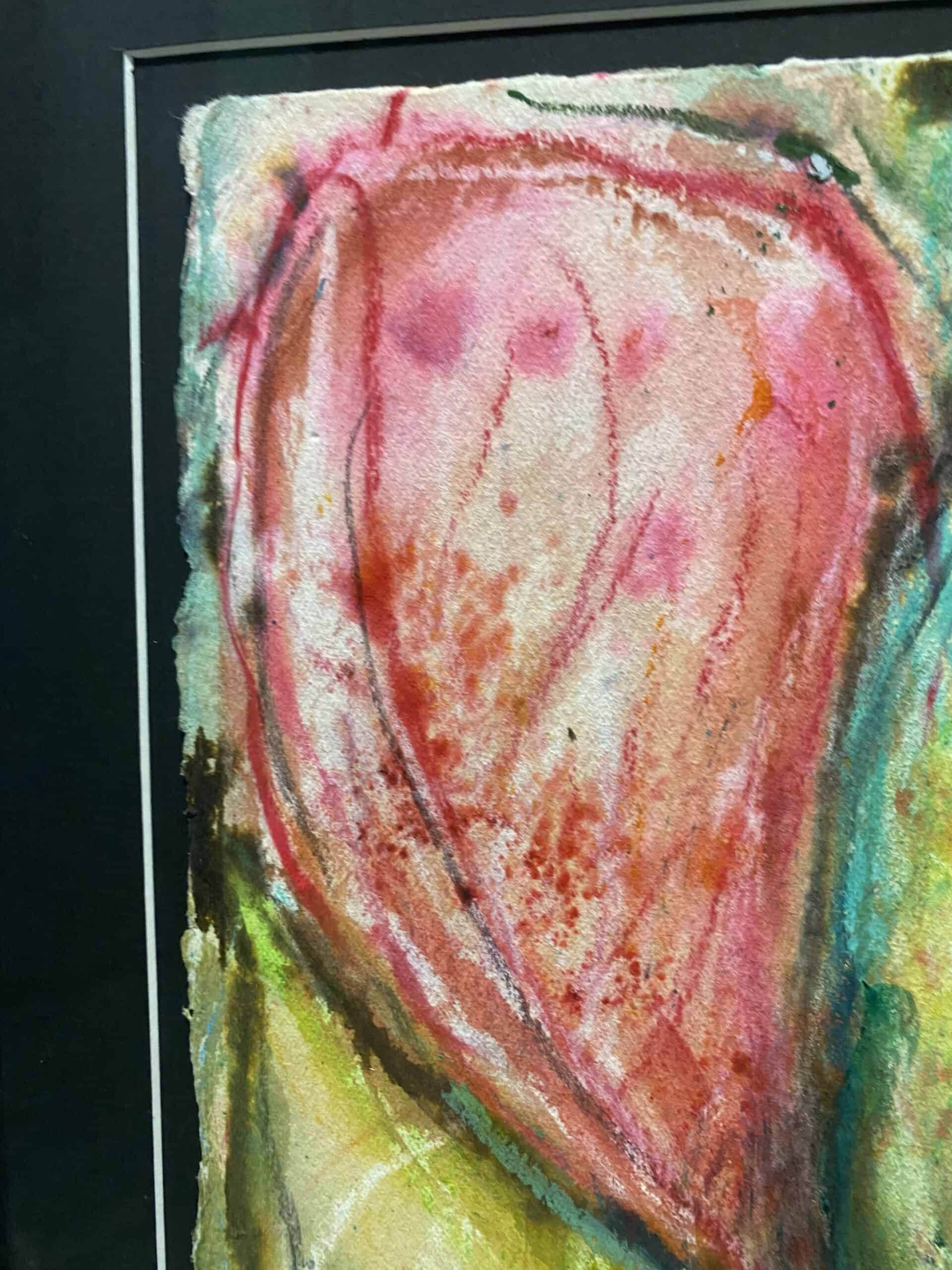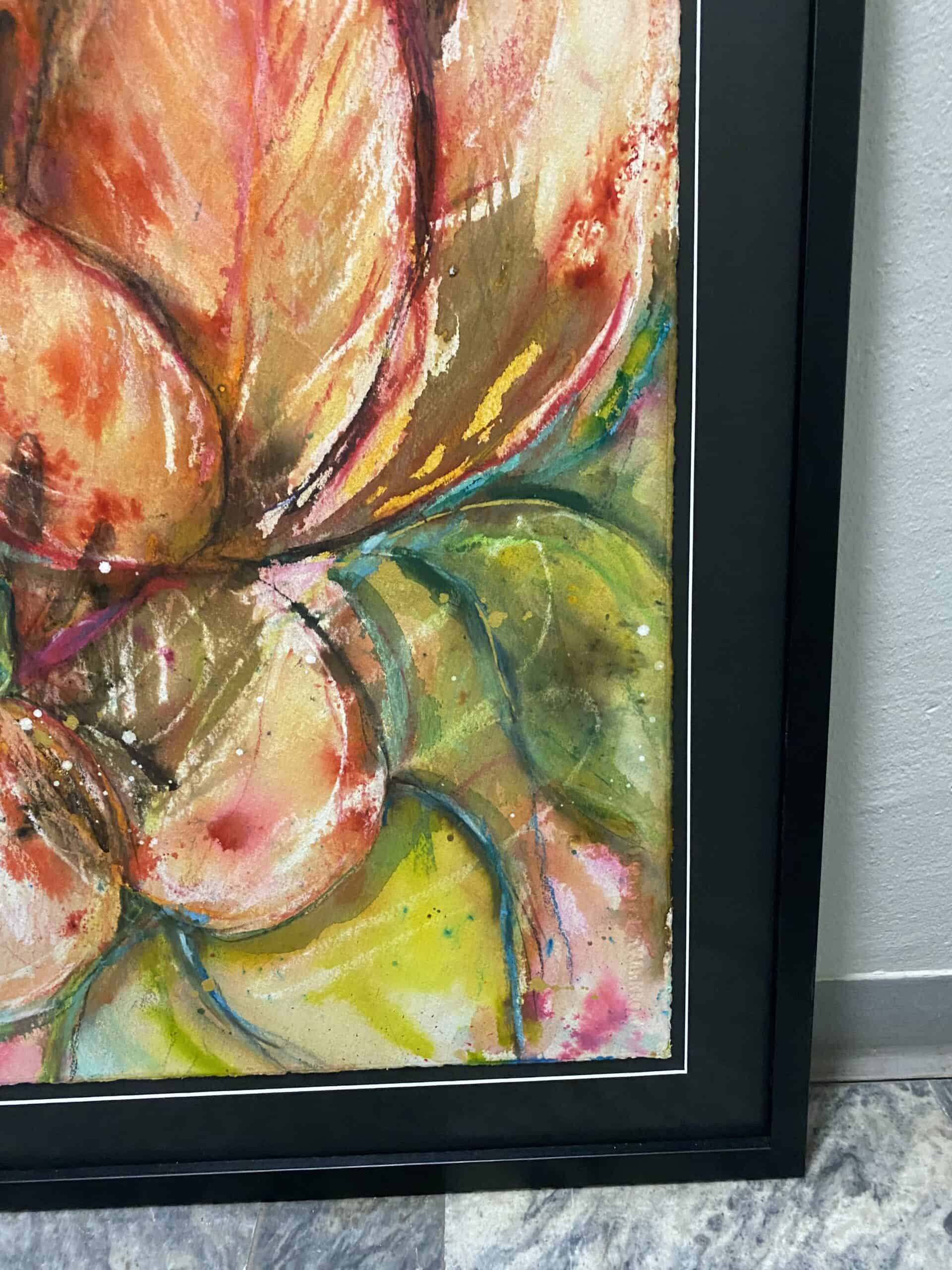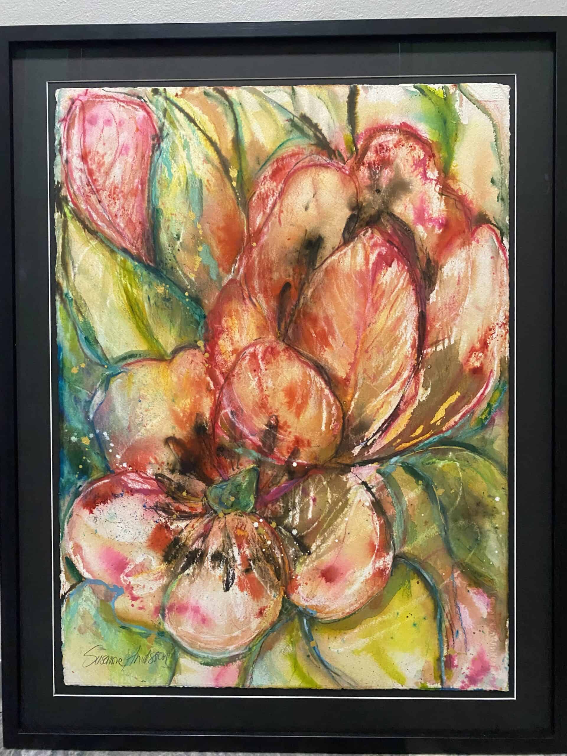 ”Denna stora akvarell är en explosion av färg, med stora tulpaner som sträcker sig över pappret, och blir en verklig mittpunkt i vilket rum som helst. Akvarellpappret med råkant har jag frilagt på en passpartou, vilket ger verket en unik och rå känsla. Glaset som skyddar denna konstnärliga skapelse är exklusivt och reflexfritt, vilket innebär att du kan beundra tavlan utan störande reflektioner.