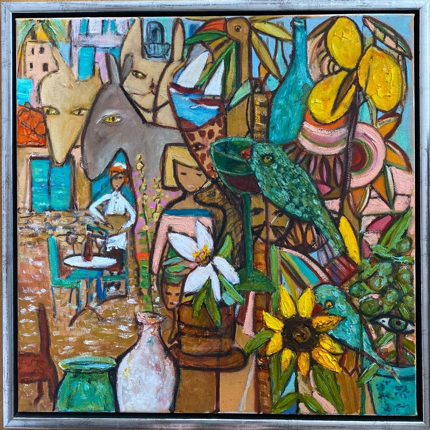 Denna målning har titeln – Me and my holliday och denna tavla har ram vilket inte är ofta på mina målningar.