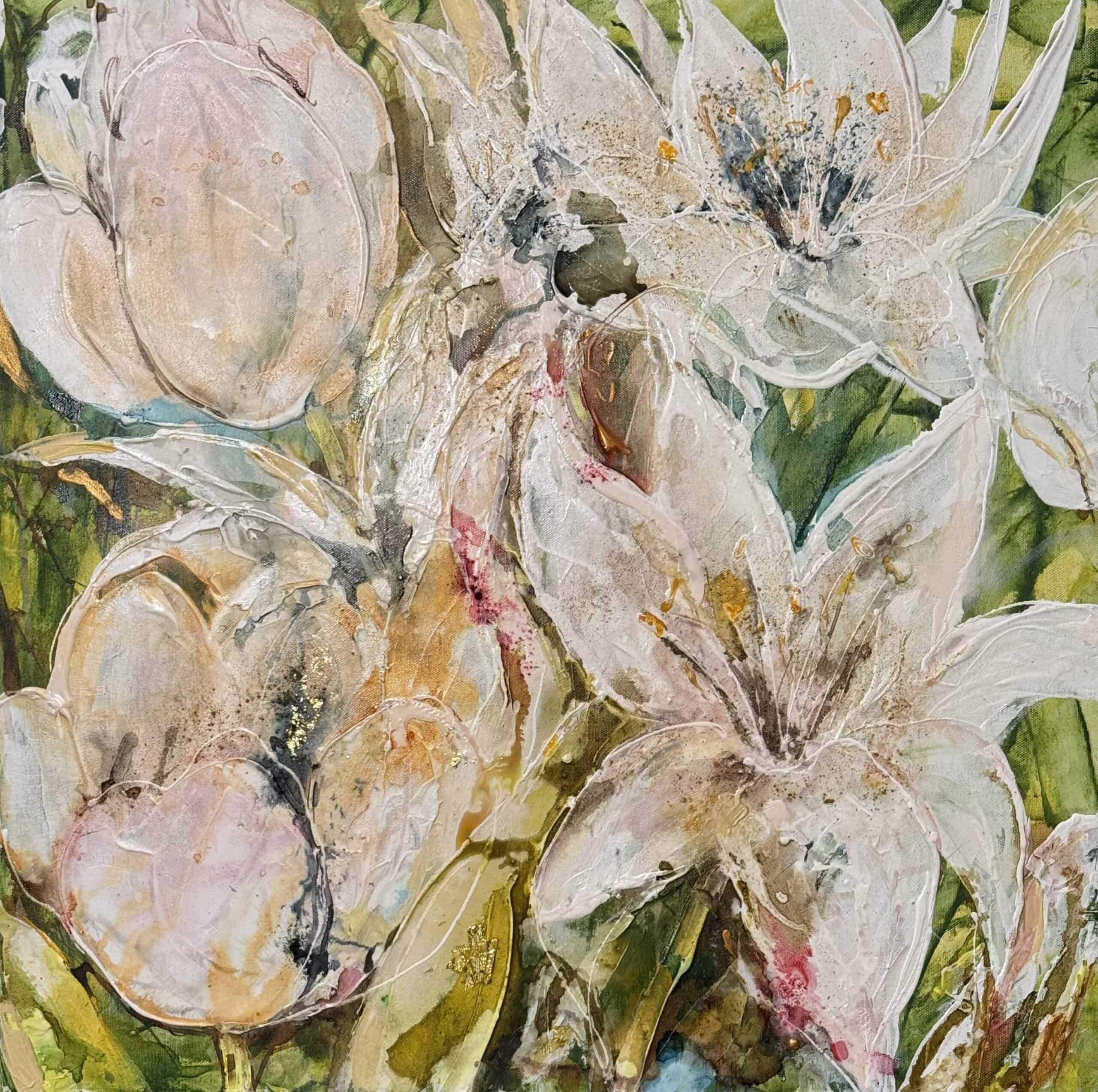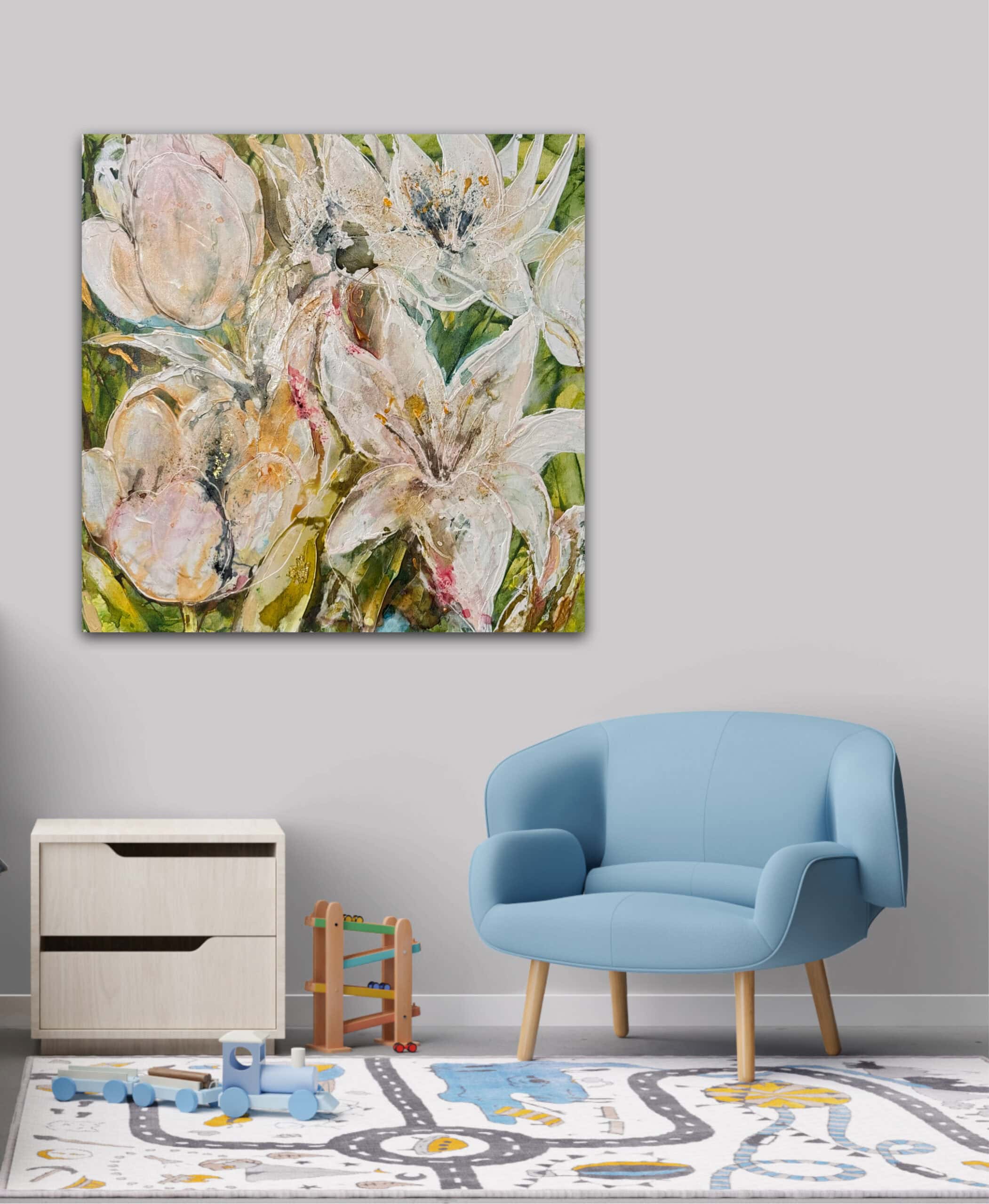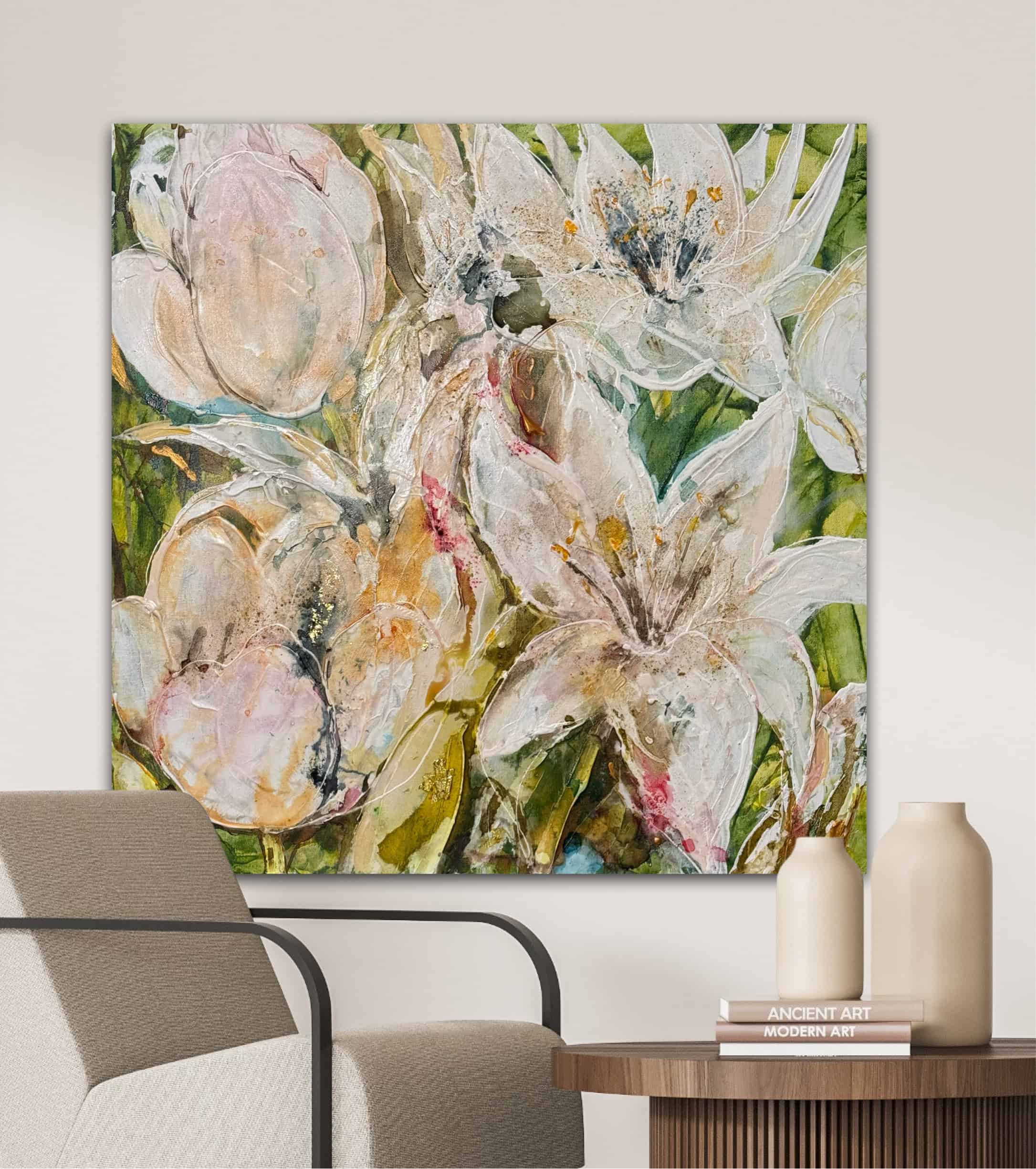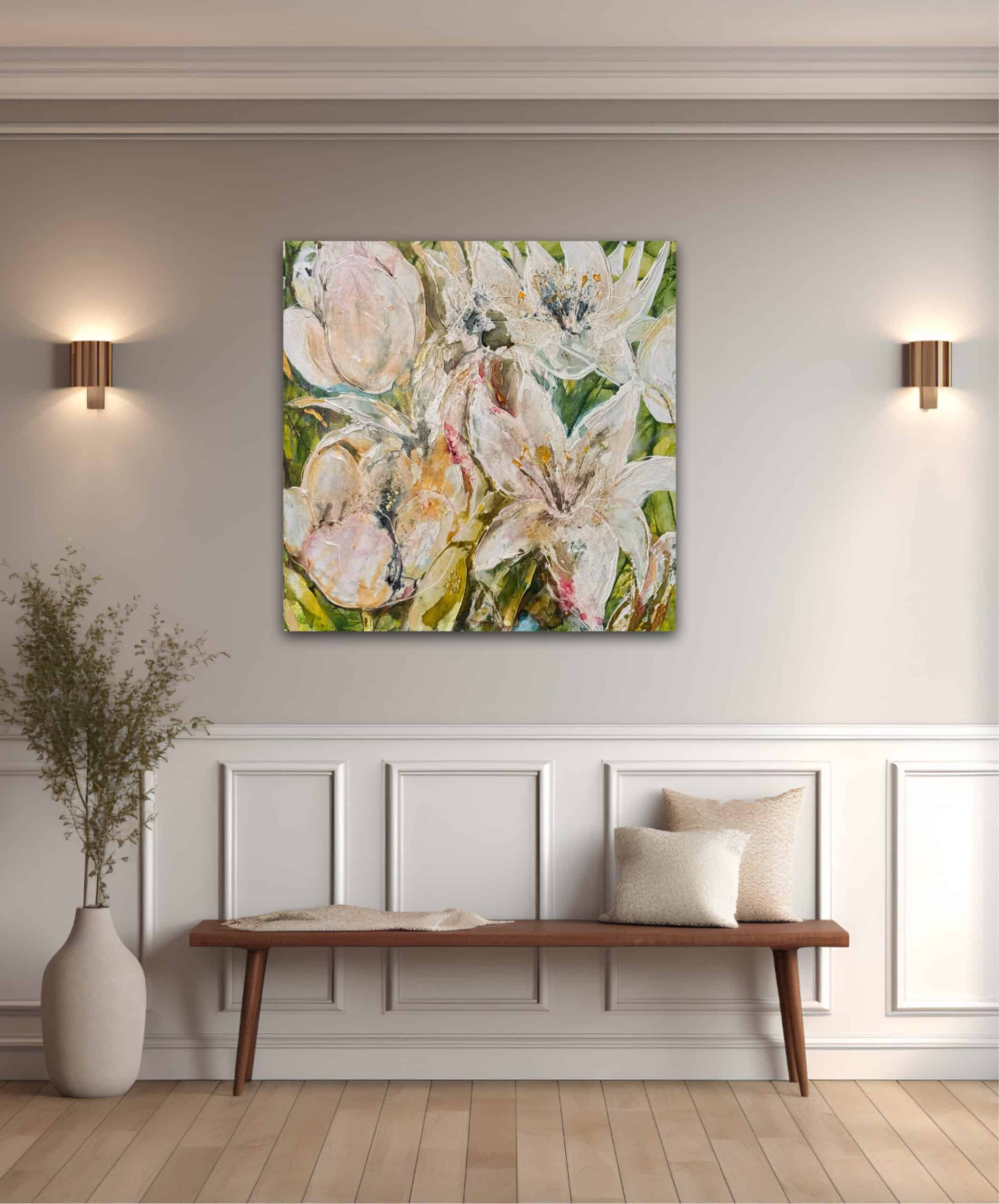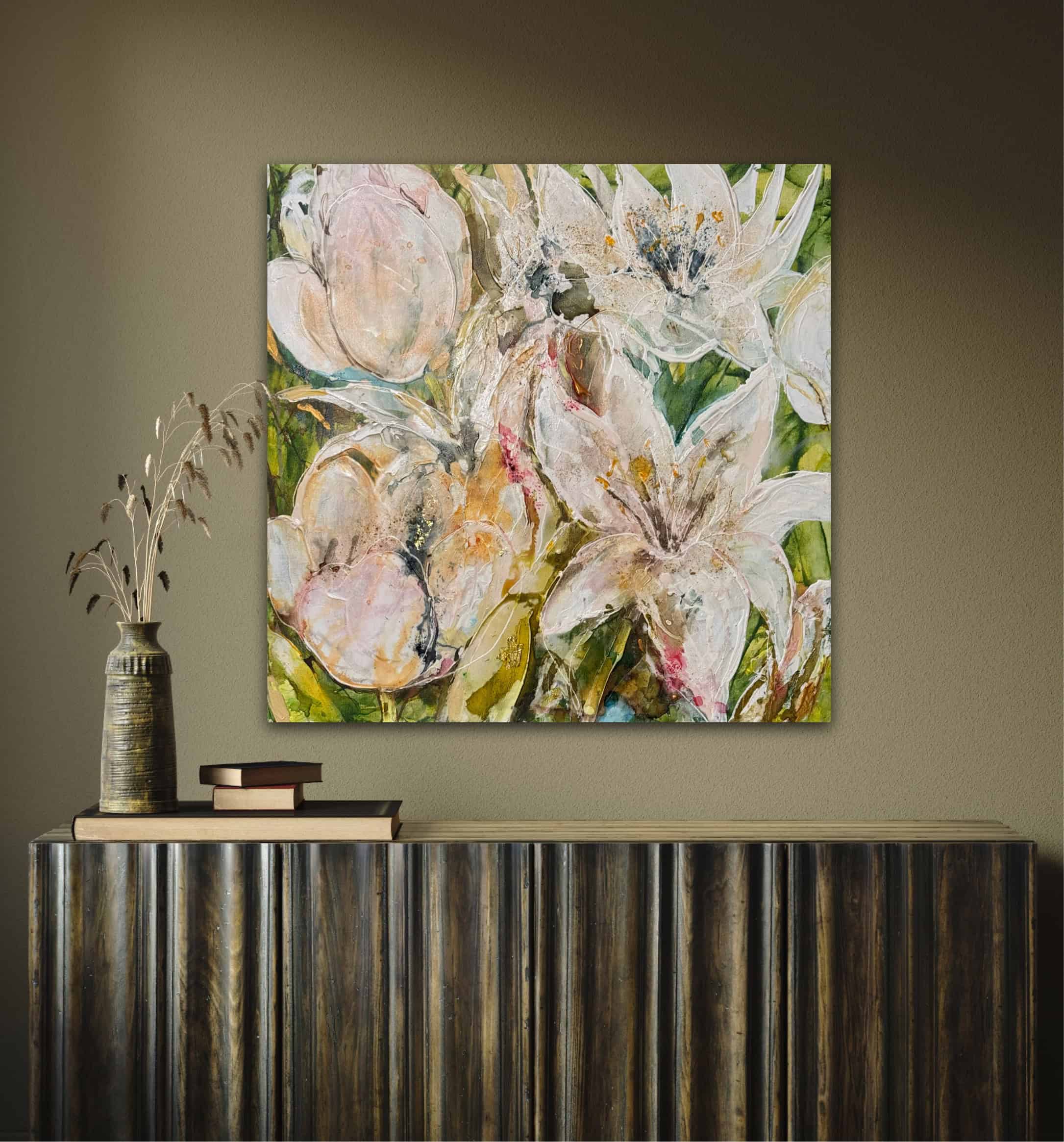 Vit blommande konst – Tavla i ljusa färger – Skapa en harmonisk känsla i ditt hem med denna vackra tavla i mjuka, ljusa färger. Tavlan mäter 70 x 70 cm och föreställer vita blommor som kan tolkas som amaryllis eller liljor, beroende på betraktarens öga. Med sin subtila och tidlösa design passar den perfekt i allt från vardagsrum till sovrum eller kontor.